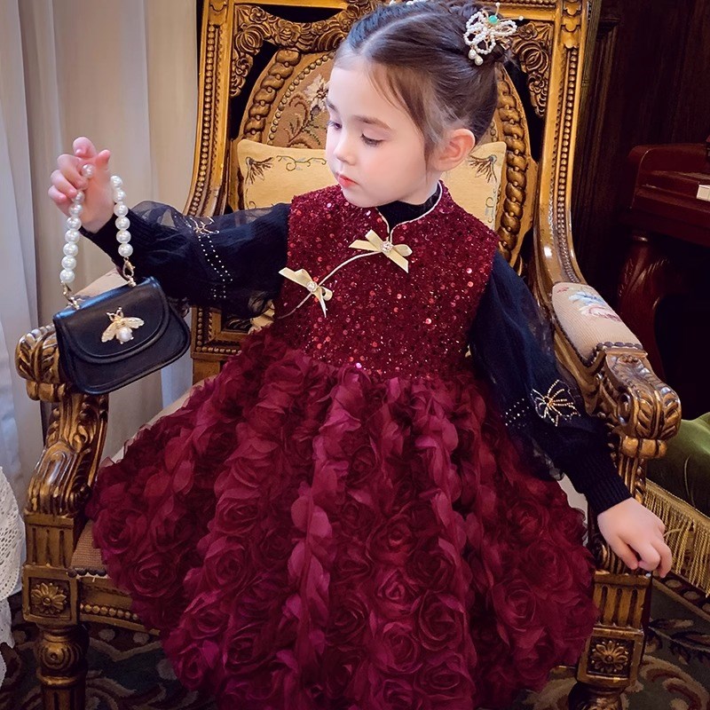 女童新年红色连衣裙冬装2024新款加绒网纱背心旗袍裙过年两件套装