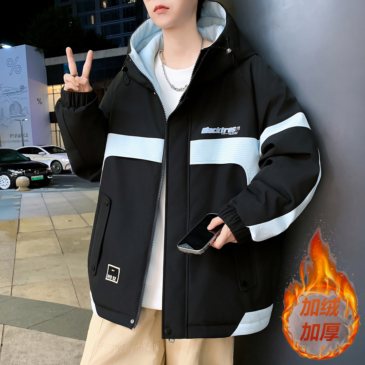 加绒加厚外套男款冬季2025新宽松连帽工装夹克青少年防寒棉衣以純