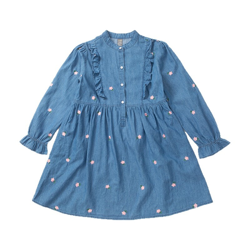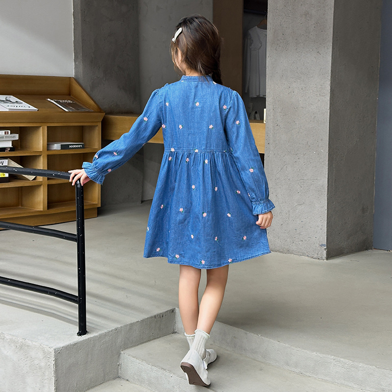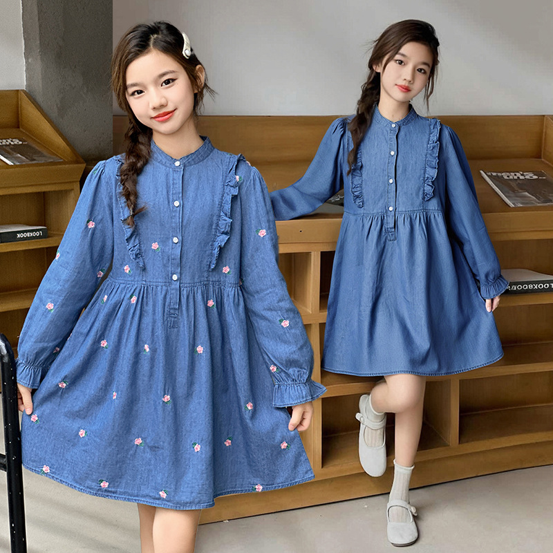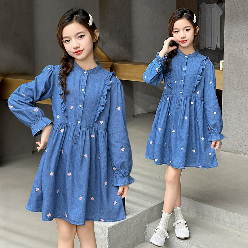 女童连衣裙2025秋季新款洋气绣花立领长袖牛仔裙儿童纯棉公主裙