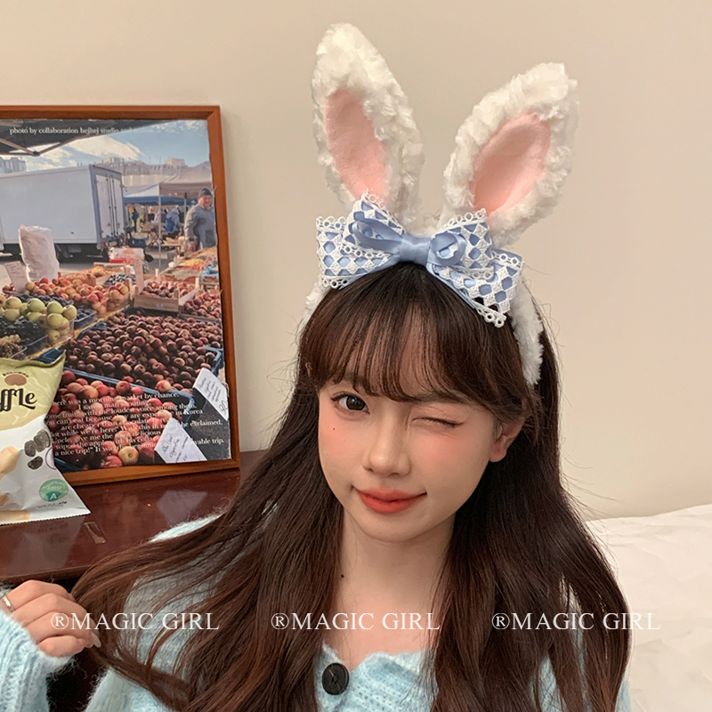 可爱粉色毛绒耳朵兔子发箍发饰蝴蝶结洗脸头箍少女洛丽塔发卡头饰