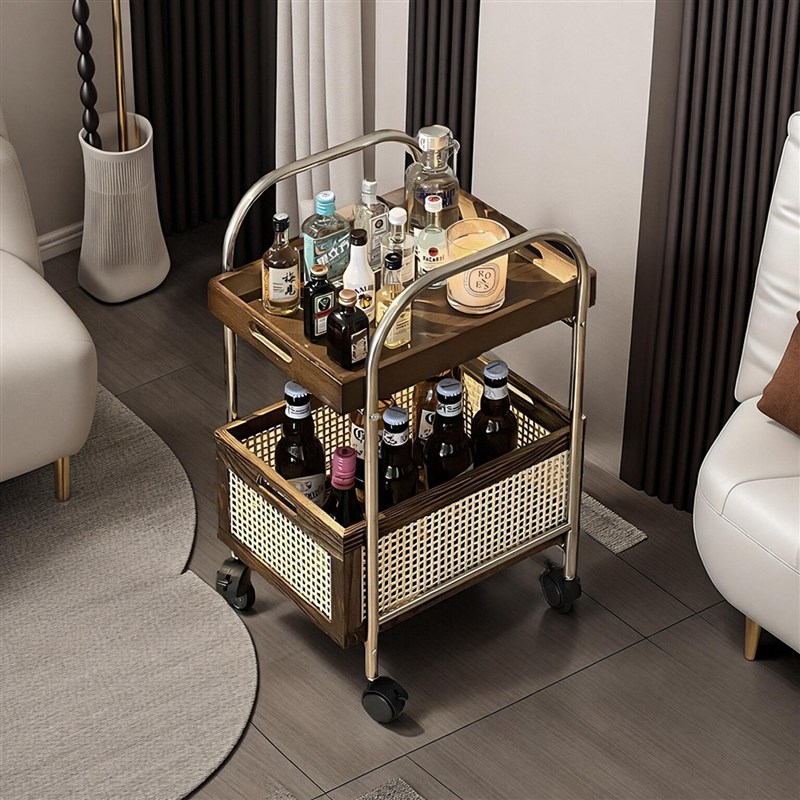 实木可移动边几茶几小桌子客厅边柜中古小推车复古零食置物架藤编