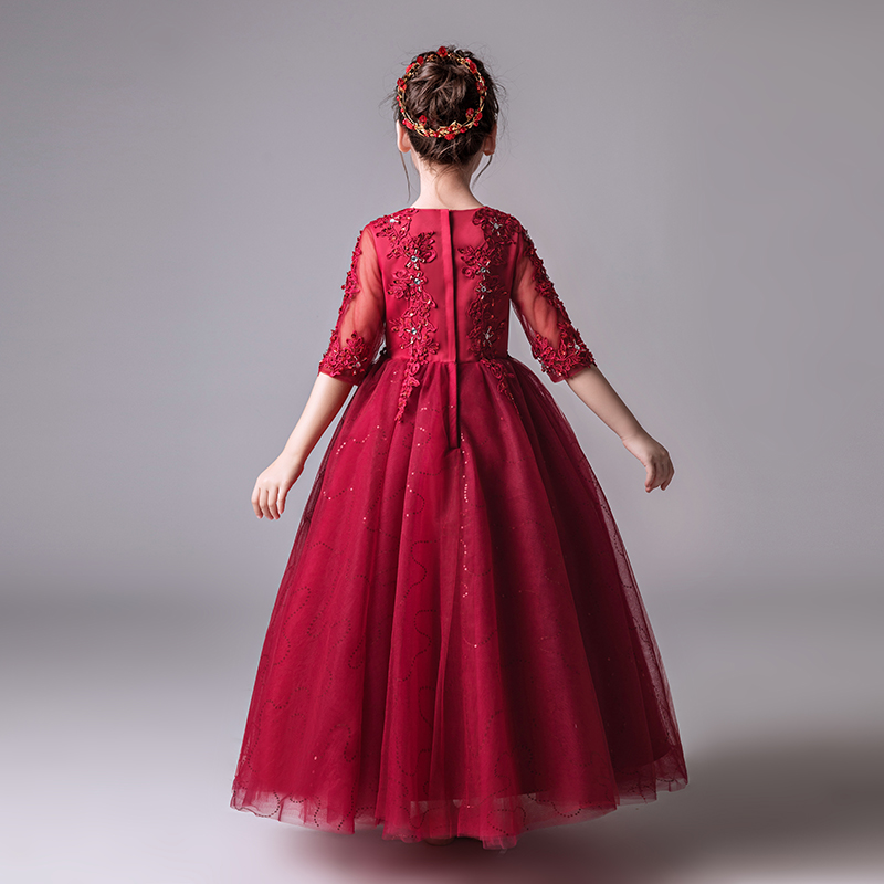 儿童礼服酒红色公主裙女童蓬蓬纱生日花童走秀小主持人演出服长款