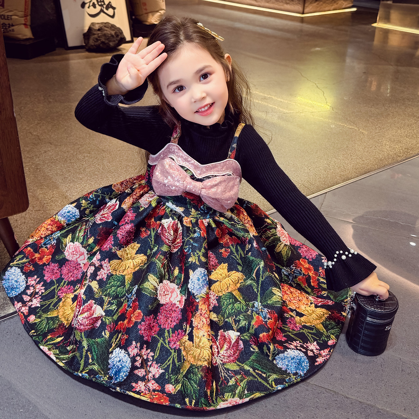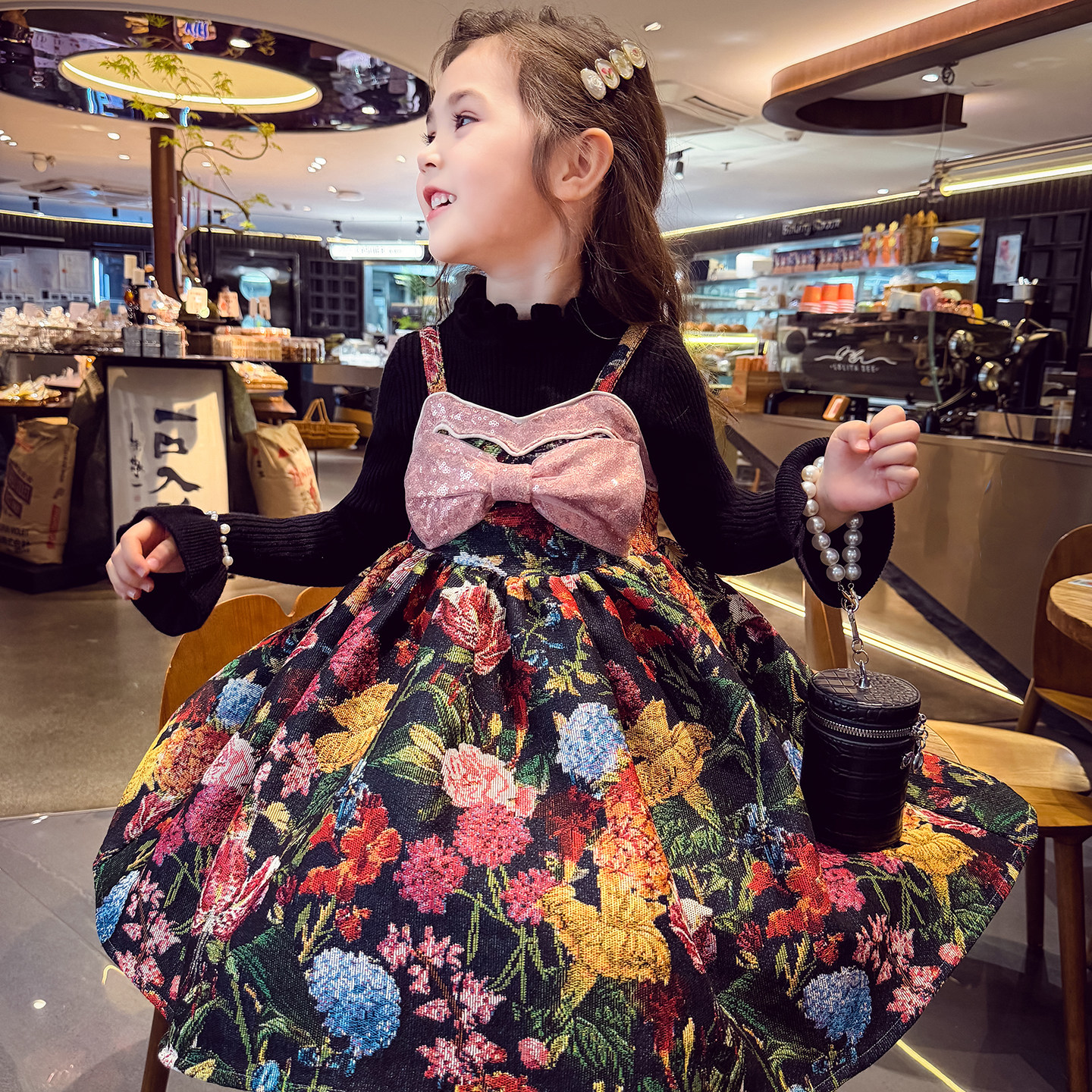 米米哈罗女童加绒连衣裙冬2025新款法式儿童碎花吊带裙女孩公主裙