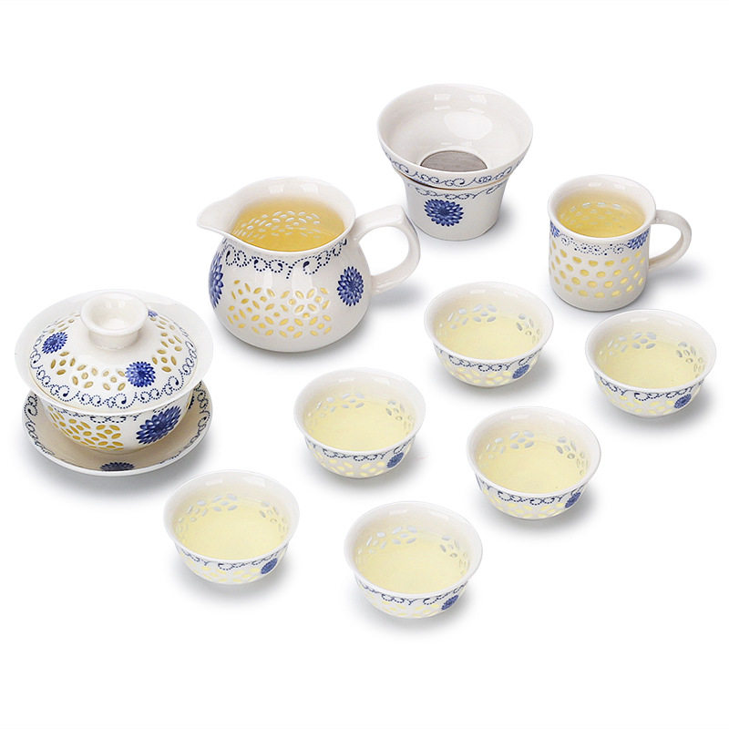 玲珑茶具套装家用整套陶瓷茶杯盖碗泡茶壶蜂窝青花瓷冲茶器