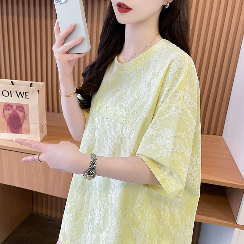 大码女装设计感蕾丝刺绣短袖T恤女夏季中长款宽松显瘦百搭上衣潮