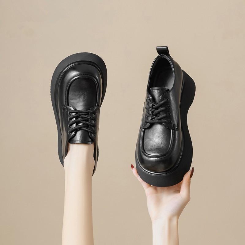 松糕厚底乐福鞋女2025春季新款厚底增高系带单鞋英伦黑色小皮鞋女