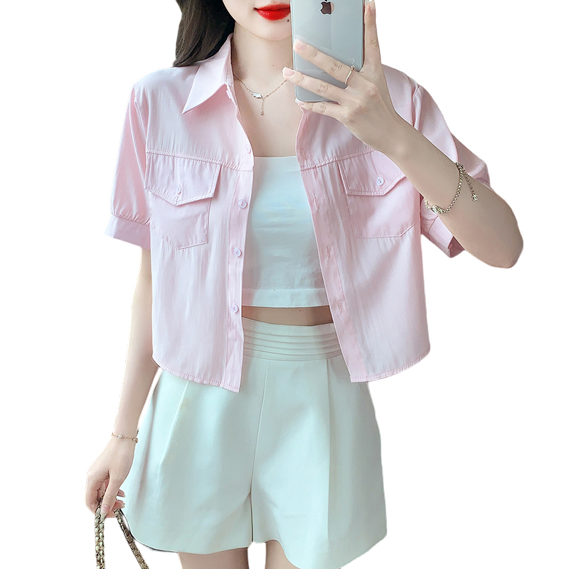 白色短袖衬衫女夏季薄款2025新款小众外搭宽松短款polo领上衣外套