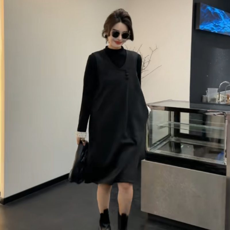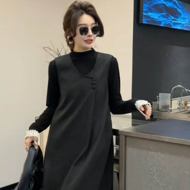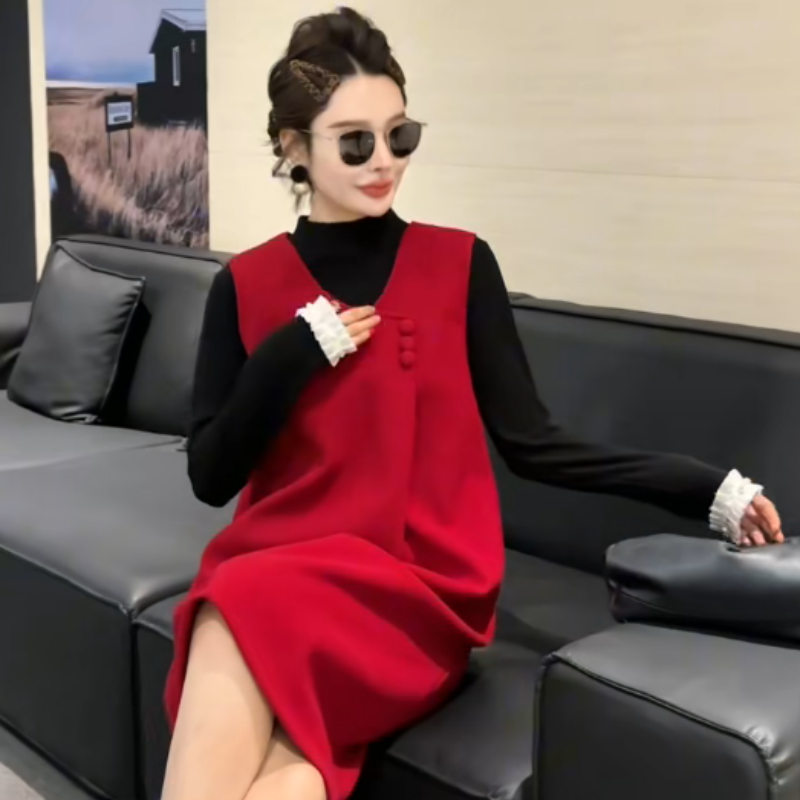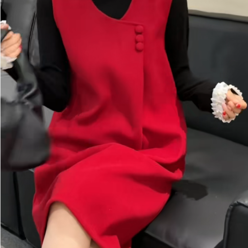 2026春季新款简约韩版红色背心套装V领毛呢马甲+打底时尚大码套裙