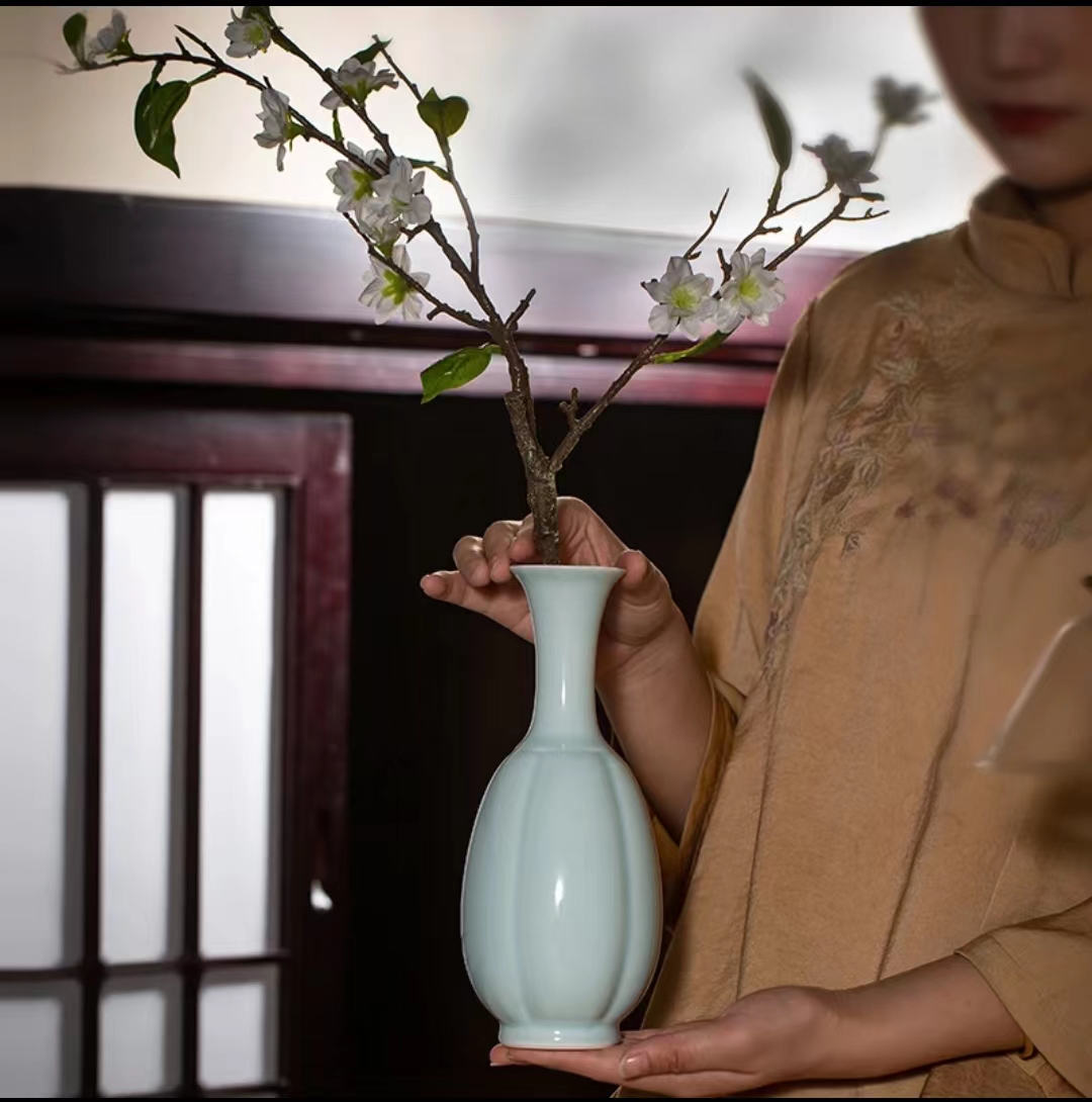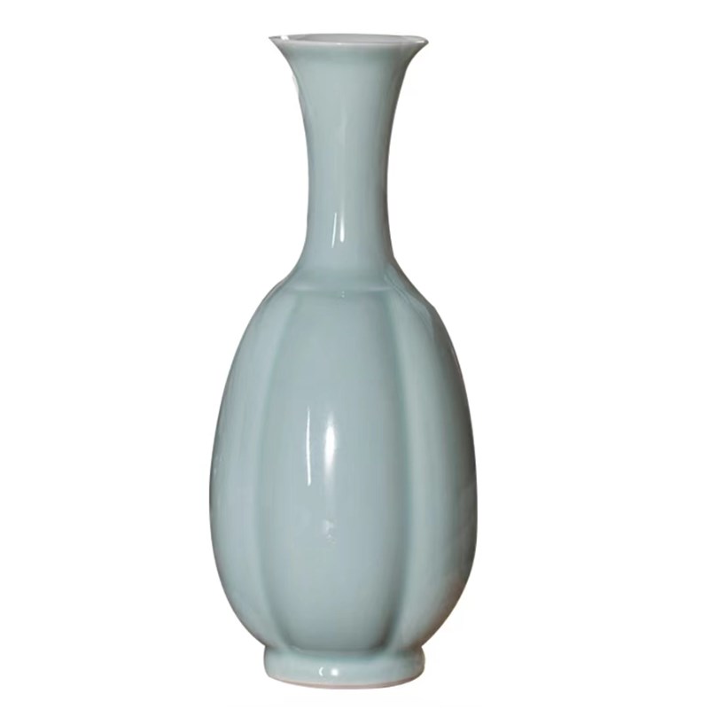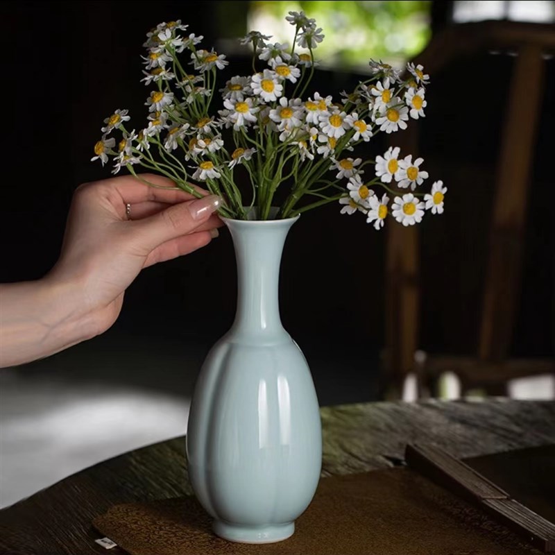 仿宋影青瓜棱瓶陶瓷花瓶摆件桌面装饰花器禅意中式插花器皿景德镇