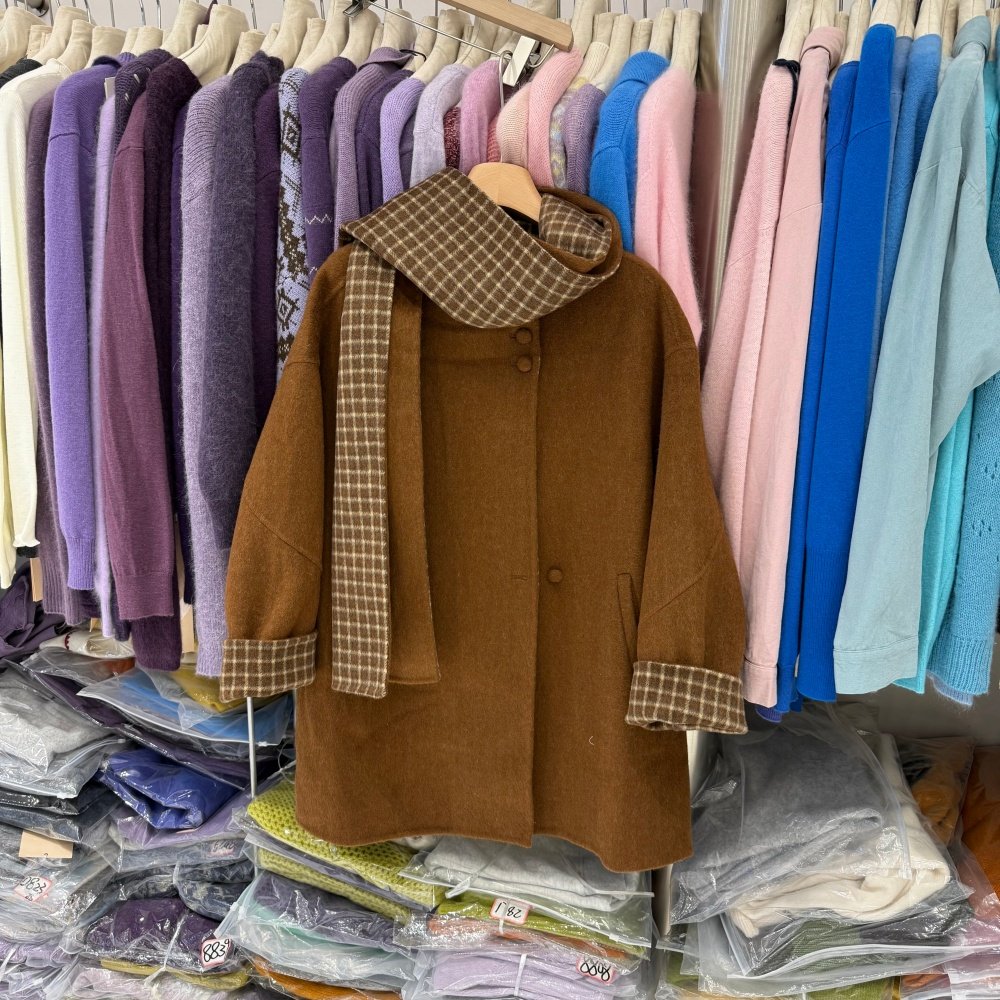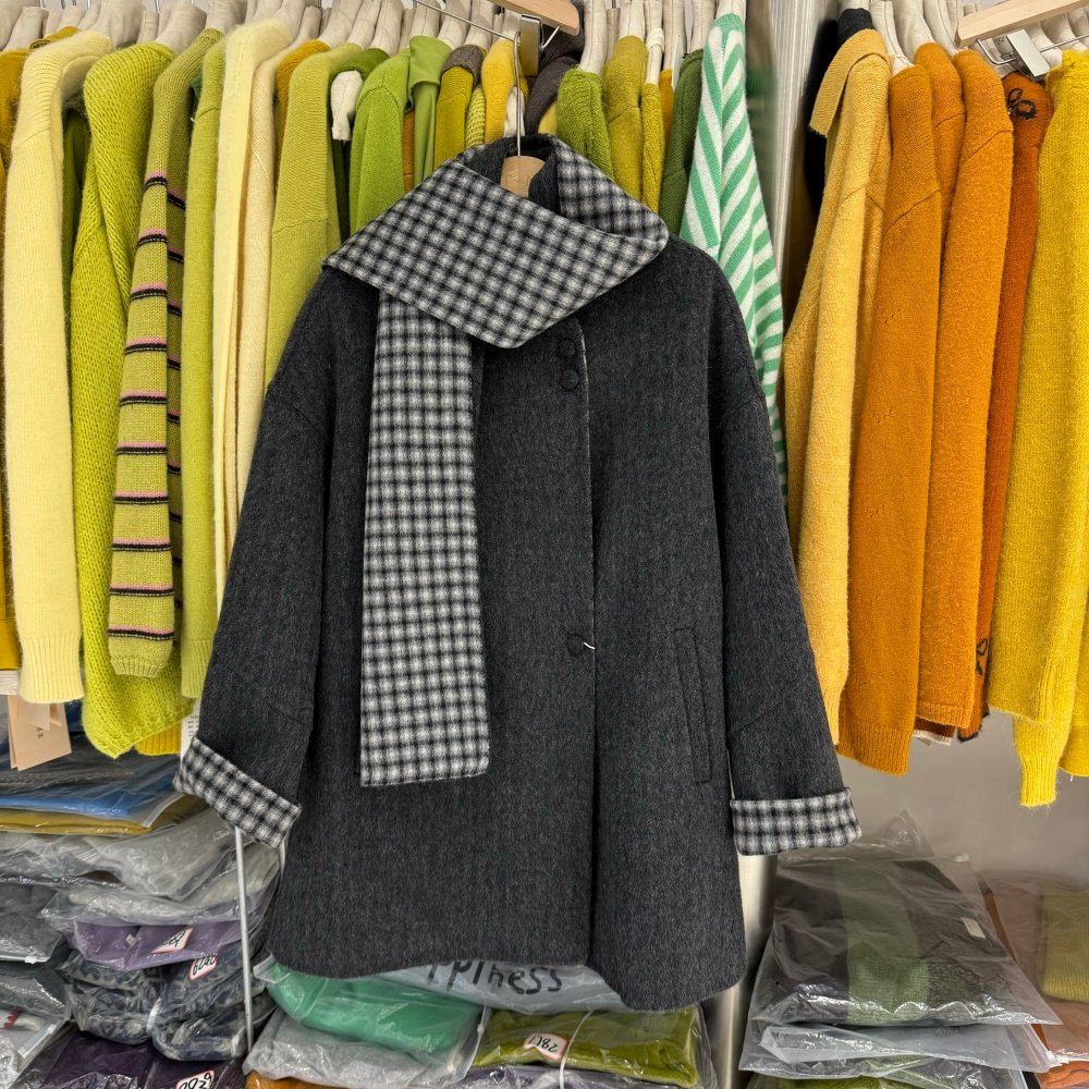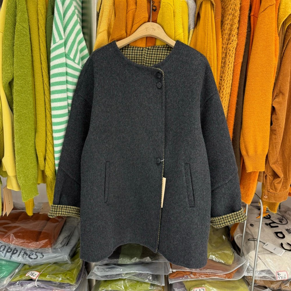 韩版秋冬氛围感小个子中长款双面羊绒大衣女拼格子毛呢外套88078