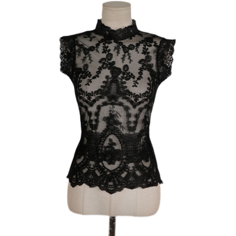 设计感小众轻熟黑色网纱性感长袖雪纺衬衫气质修身蕾丝透视上衣女