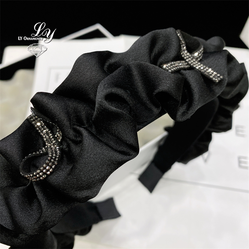 韩国新款高级感黑色缎面褶皱水钻蝴蝶结发箍女高颅顶头箍发卡发饰
