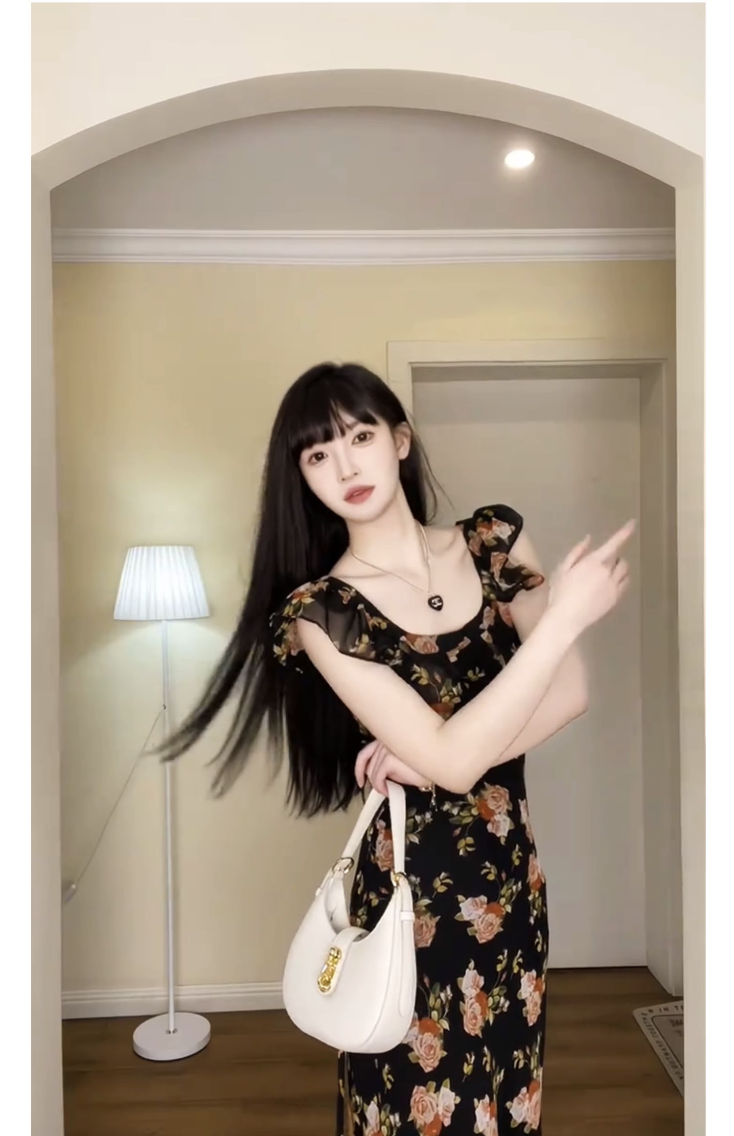 2024夏度假风法式高个子复古黑色碎花长裙子小飞袖修身显瘦连衣裙