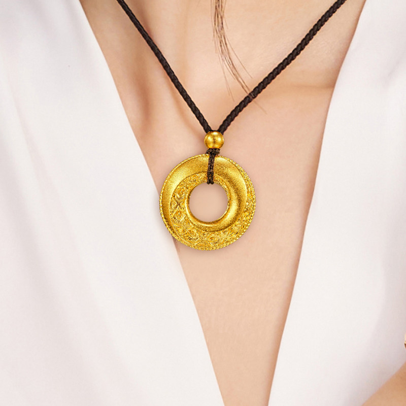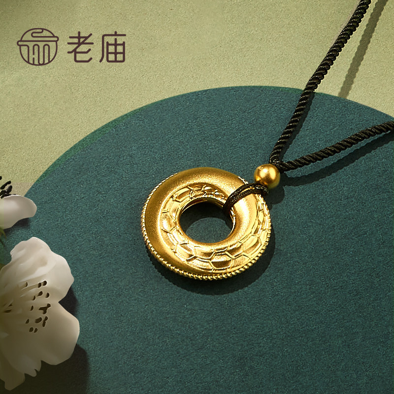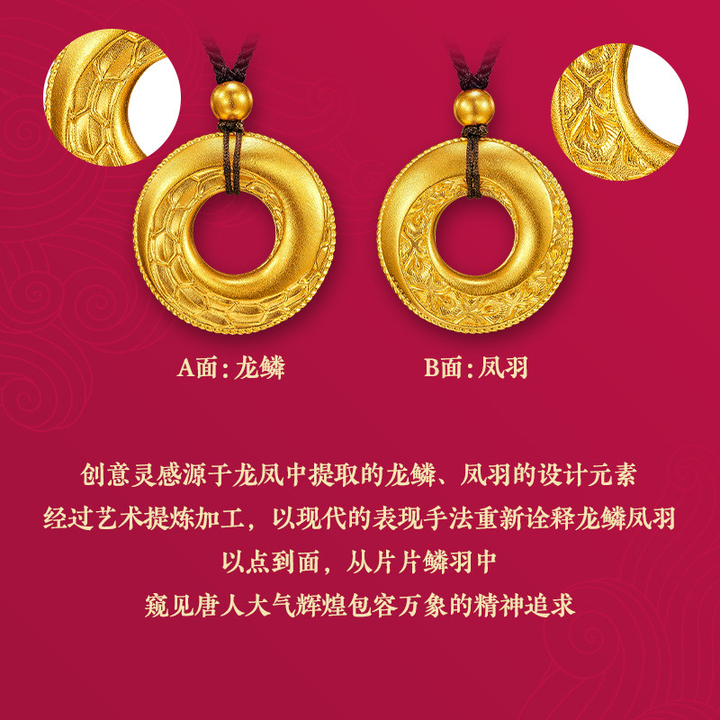 老庙黄金鸿运升升古法黄金龙凤环绕吊坠中式情侣颈饰金
