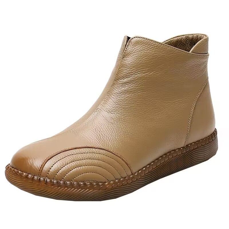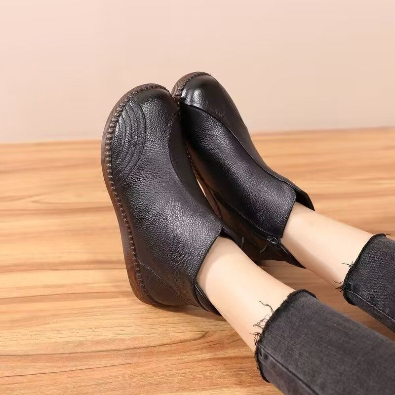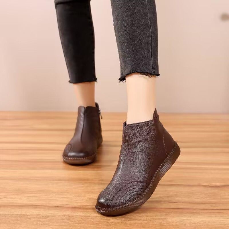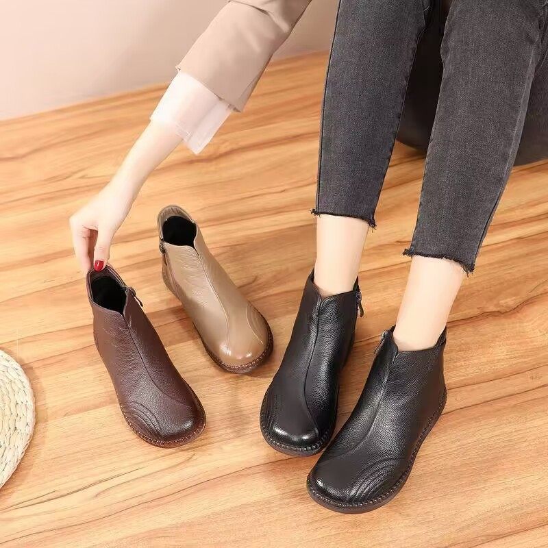 真皮短靴平底妈妈鞋中老年牛筋底