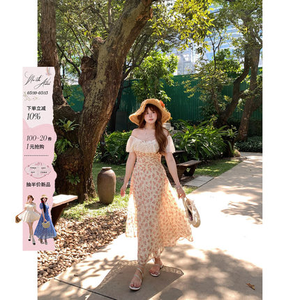 安妮不火 蕾丝花边领鱼骨收腰碎花连衣裙女微胖大码甜美系公主裙