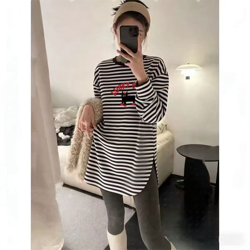 纯色开叉长袖T恤女春秋季2026欧货爆款弧下摆宽松中长款磨毛上衣