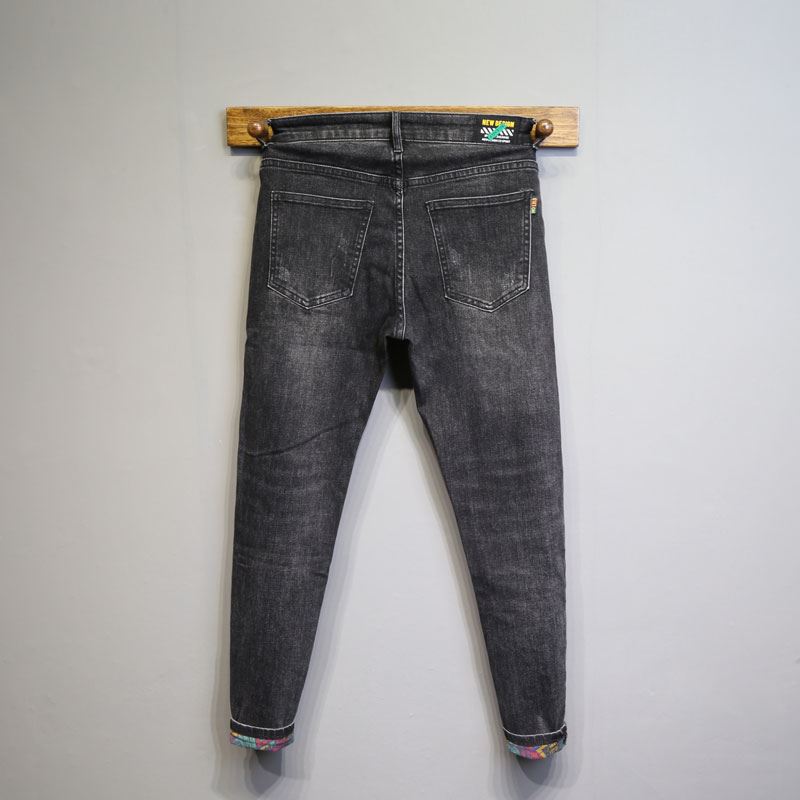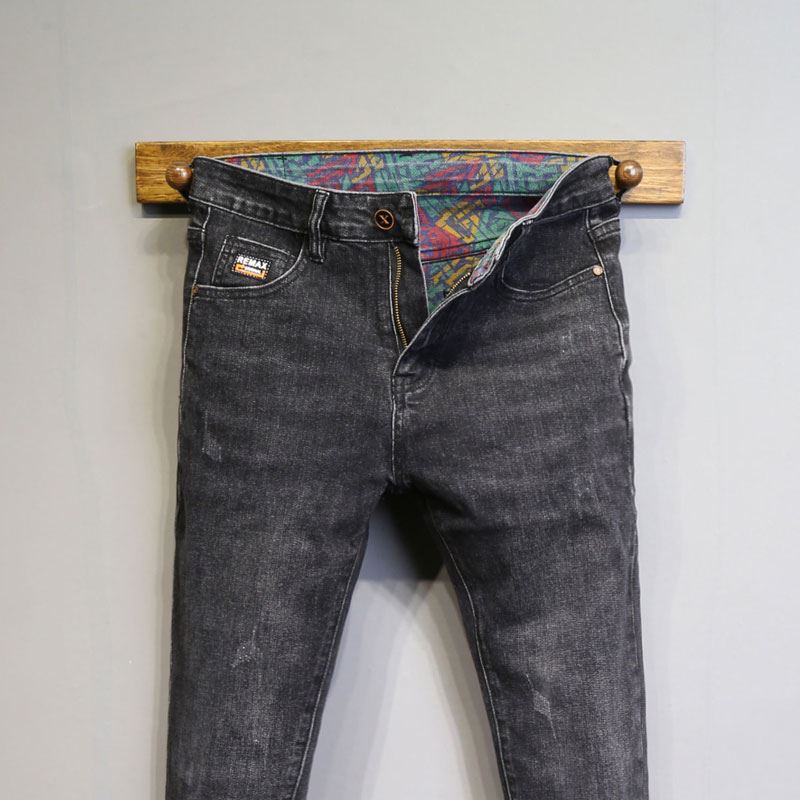 原创黑灰色刮烂彩色内衬修身牛仔长裤 男 青年时尚百搭弹力小脚裤