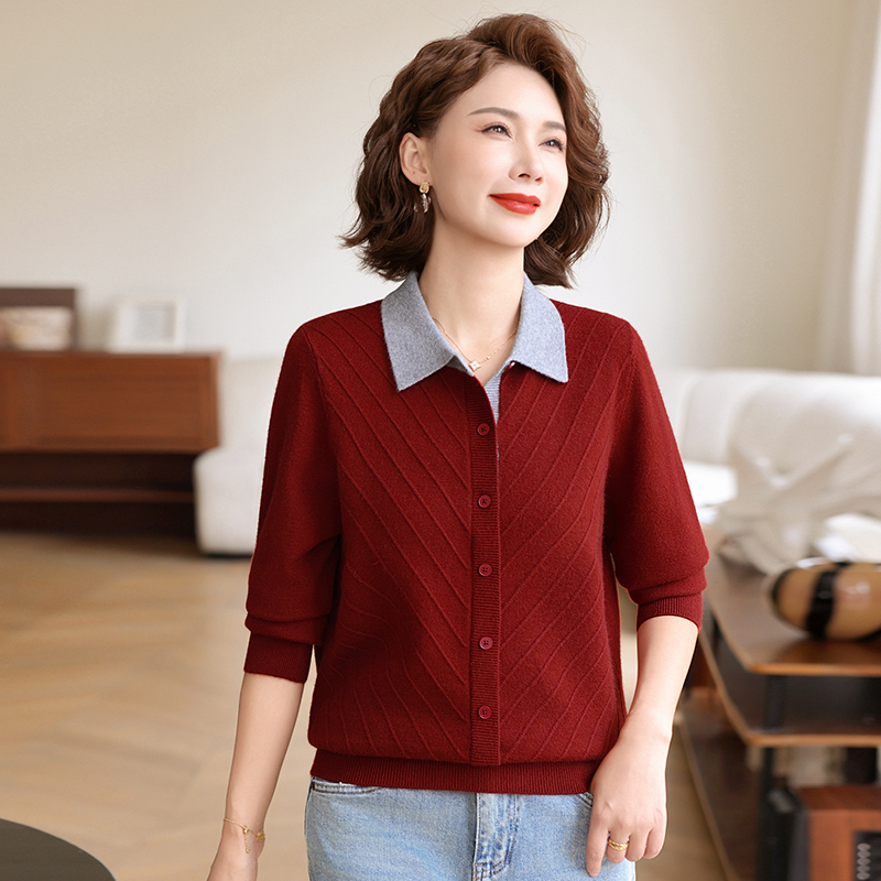 妈妈翻领羊毛衫毛衣女春秋开衫
