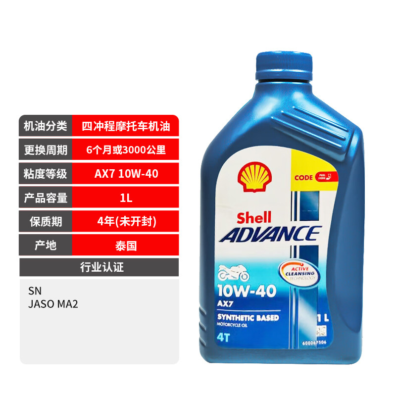 【自营】壳牌爱德王子半合成摩托车机油SN AX7 10W-40进口1L*2