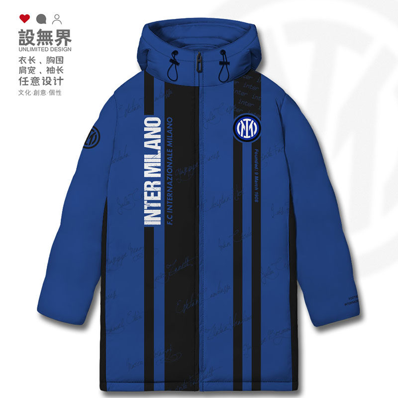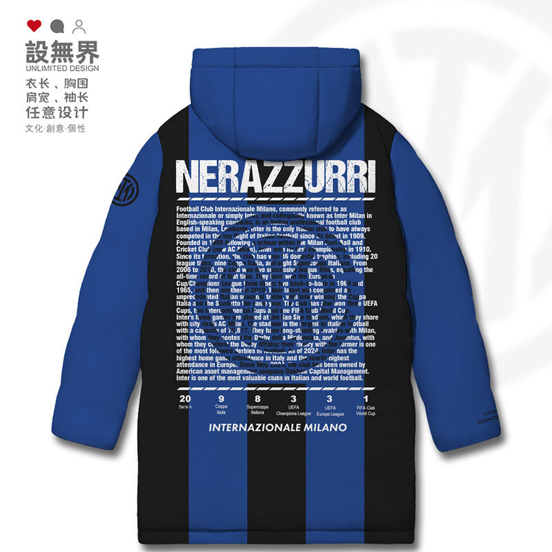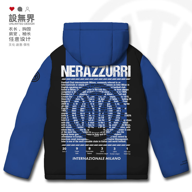 国际米兰足球俱乐部主场球迷蓝黑军团周边连帽羽绒服男女设 无界