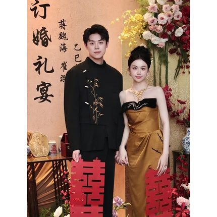 欢喜橙【蛮瑛】新中式男订婚礼服金竹刺绣中山装垫肩西服套装唐装