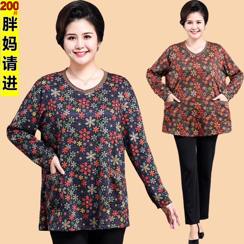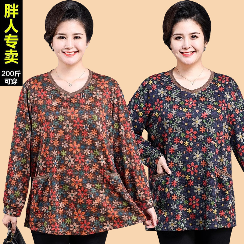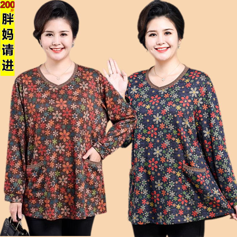 300斤胖妈妈奶奶加肥加大码春秋装打底衫新款宽松中老年人女装T恤