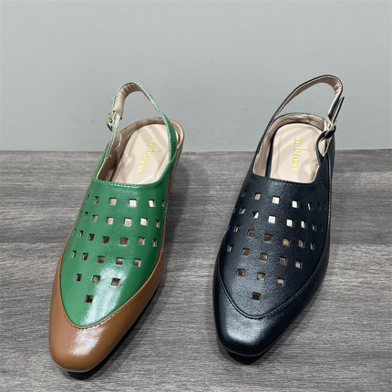 断码处理真皮镂空粗跟包头凉鞋女款夏季2025新款中跟牛皮洞洞鞋女
