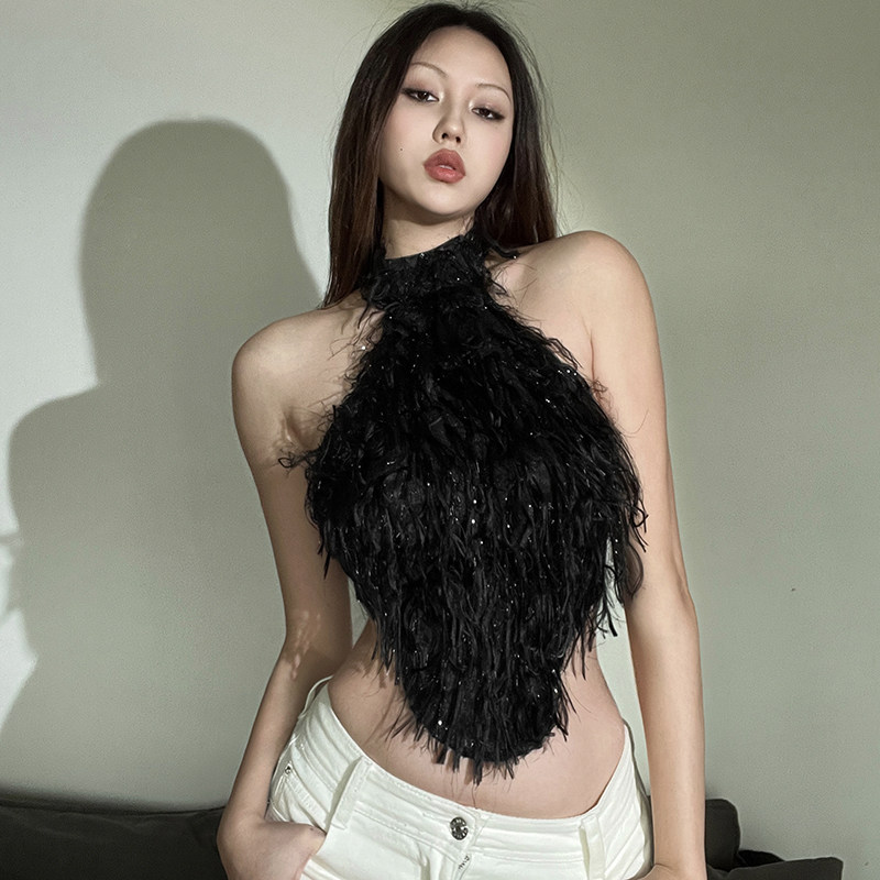 SylCue辣妹夜店蹦迪毛毛流苏挂脖吊带心机露背显瘦不规则无袖背心