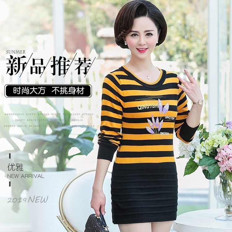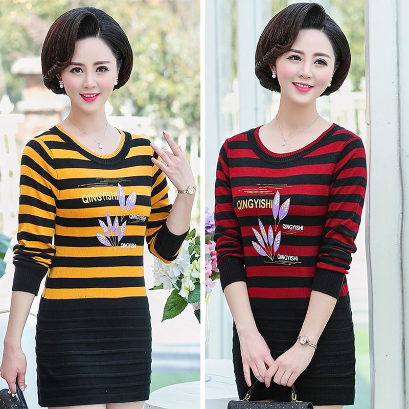 秋冬中年妈妈装条纹针织衫中老年圆领套头中长款毛衣长袖打底衫女