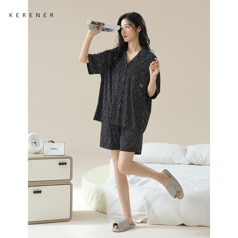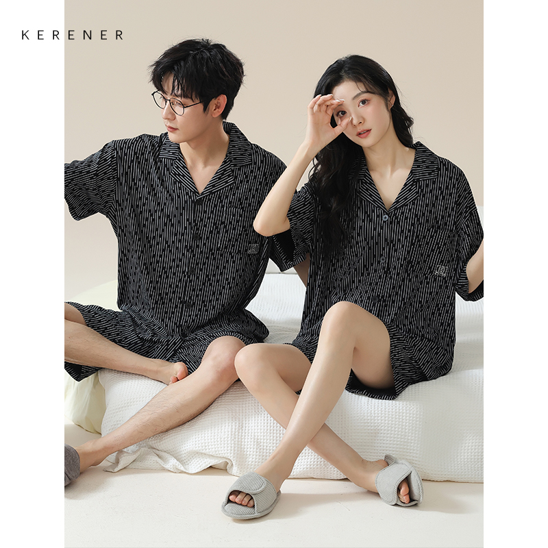 可人儿夏季情侣凉感莫代尔棉睡衣女韩版开衫短袖短裤家居服套装男