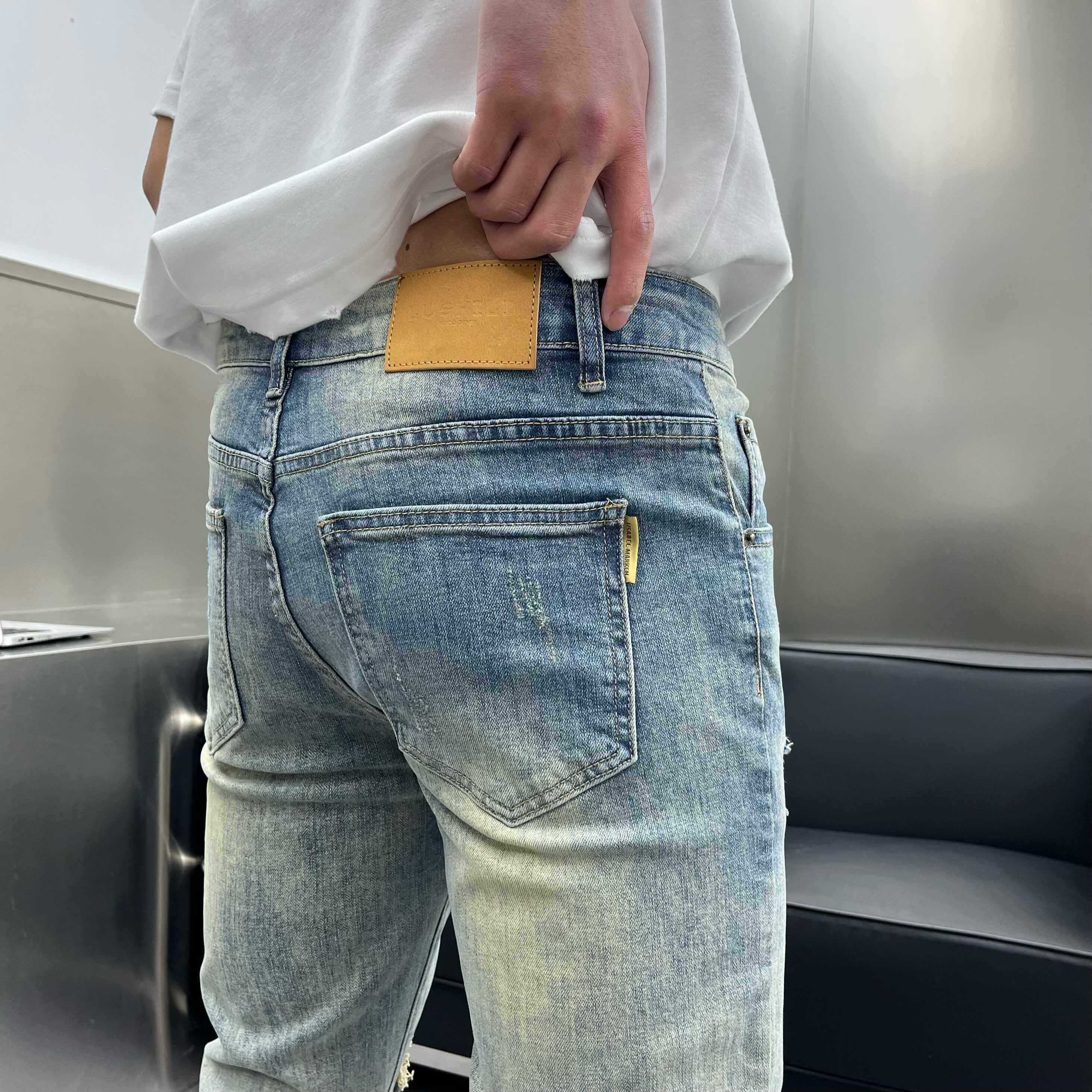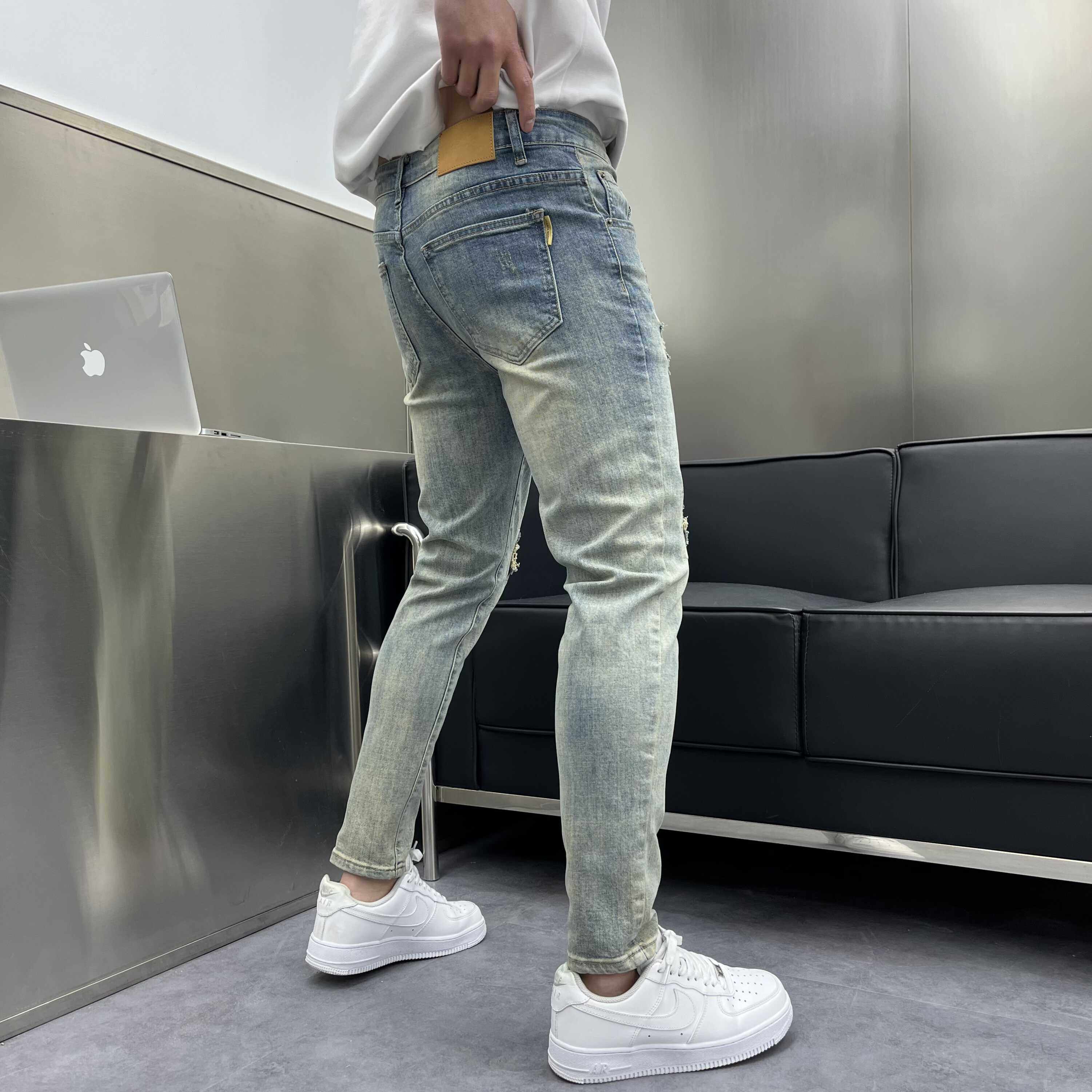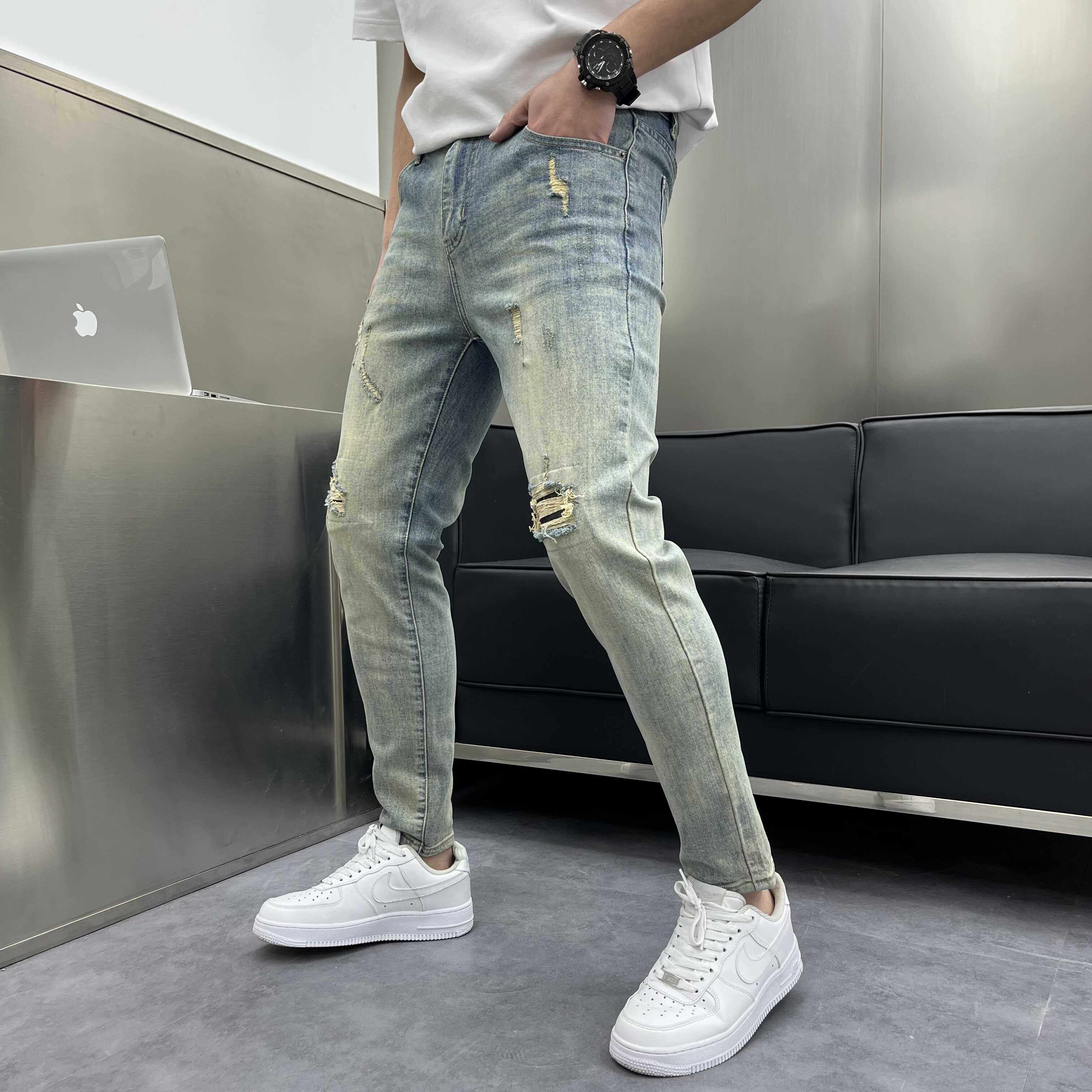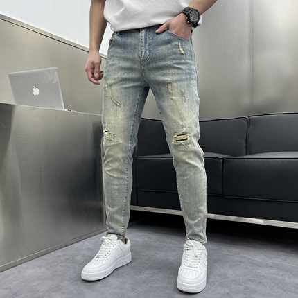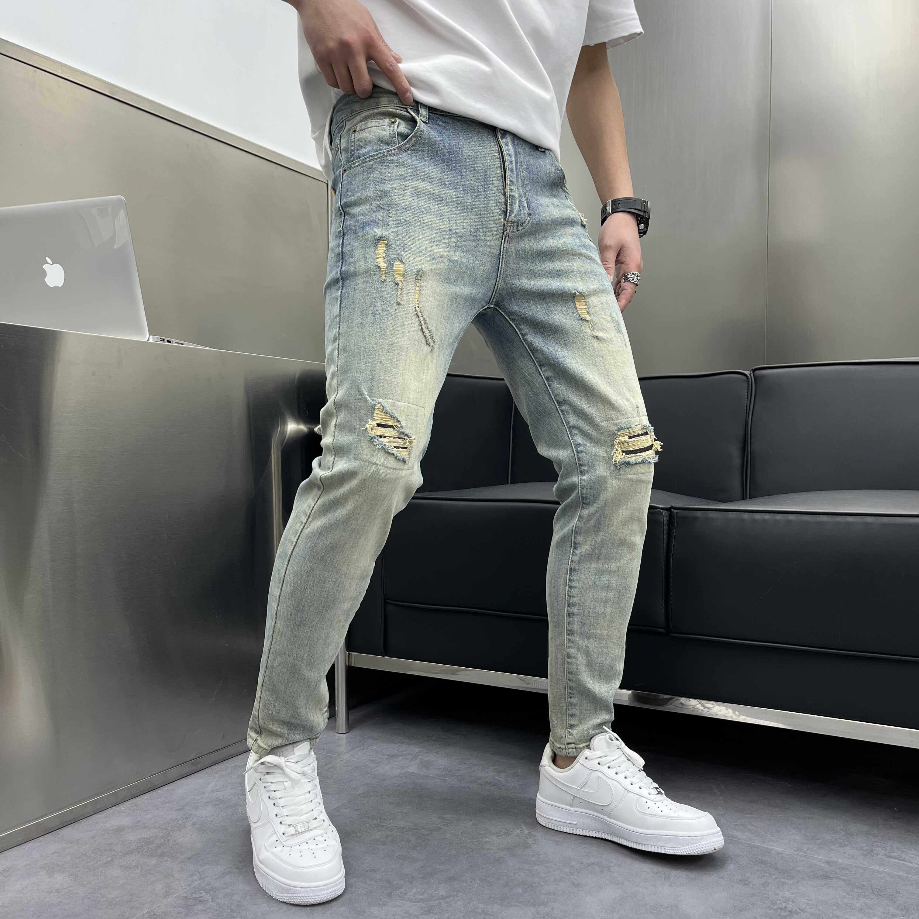 潮男薄款复古做旧蓝破洞贴布水洗弹力修身小脚牛仔长裤夏潮流休闲