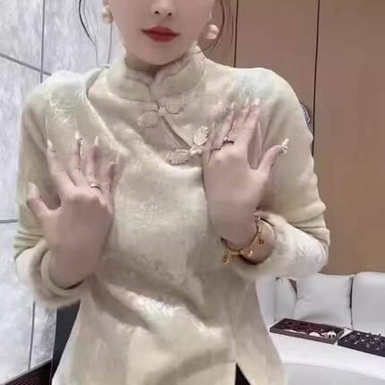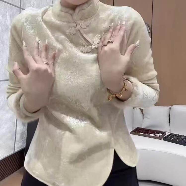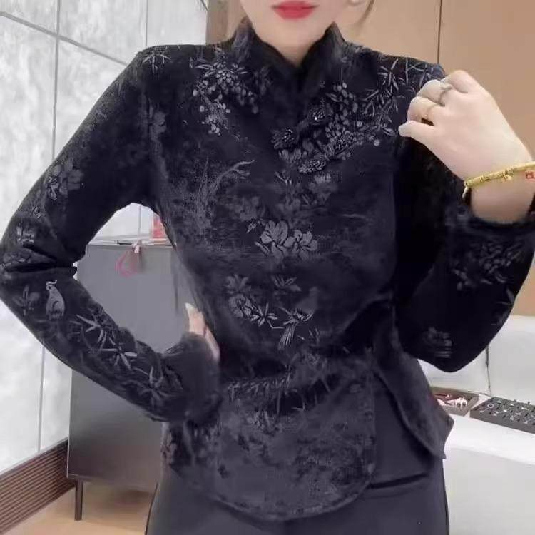 新中式国风毛毛立领修身丝绒衬衫女2025冬气质加绒打底衫上衣女