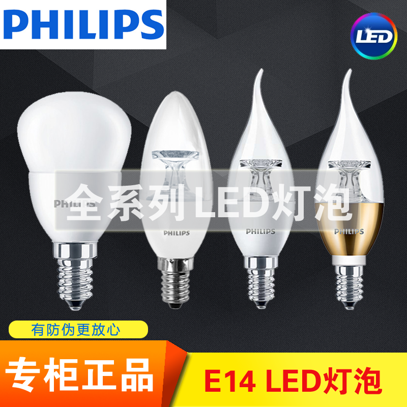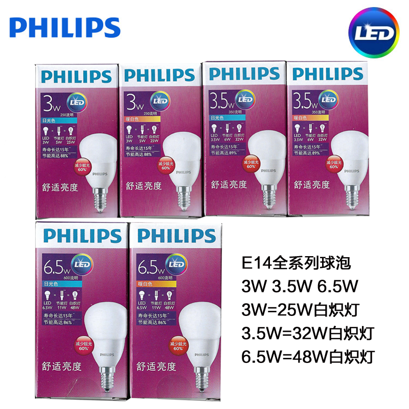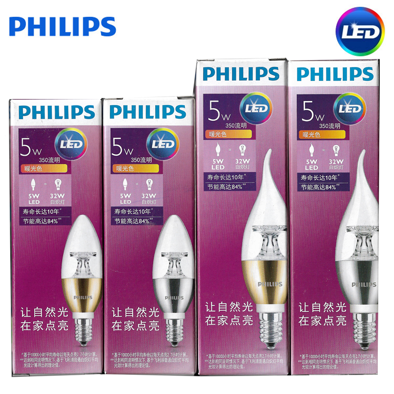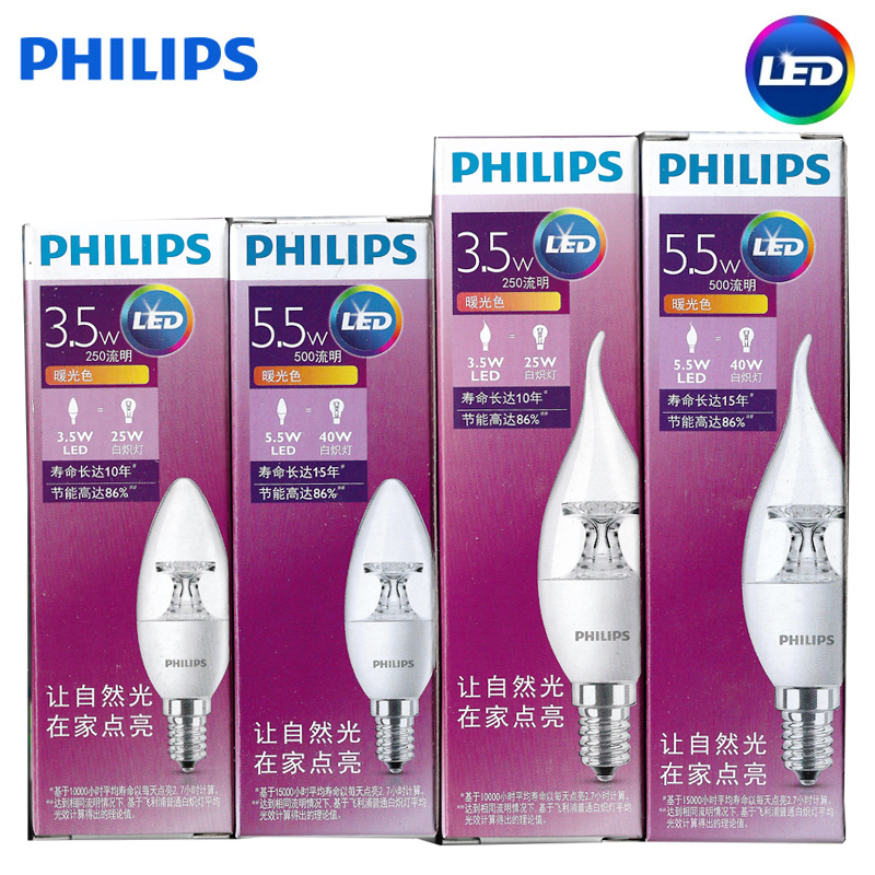 飞利浦LED灯泡 E14蜡烛泡尖泡磨砂球泡小螺口照明3.5W5W金色银色