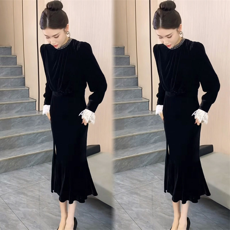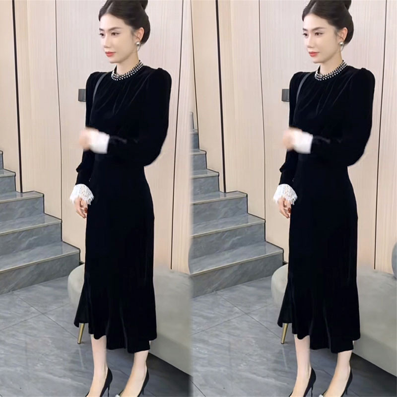 气质名媛风金丝绒连衣裙女25秋冬季复古重工钉珠显瘦设计感侧开叉