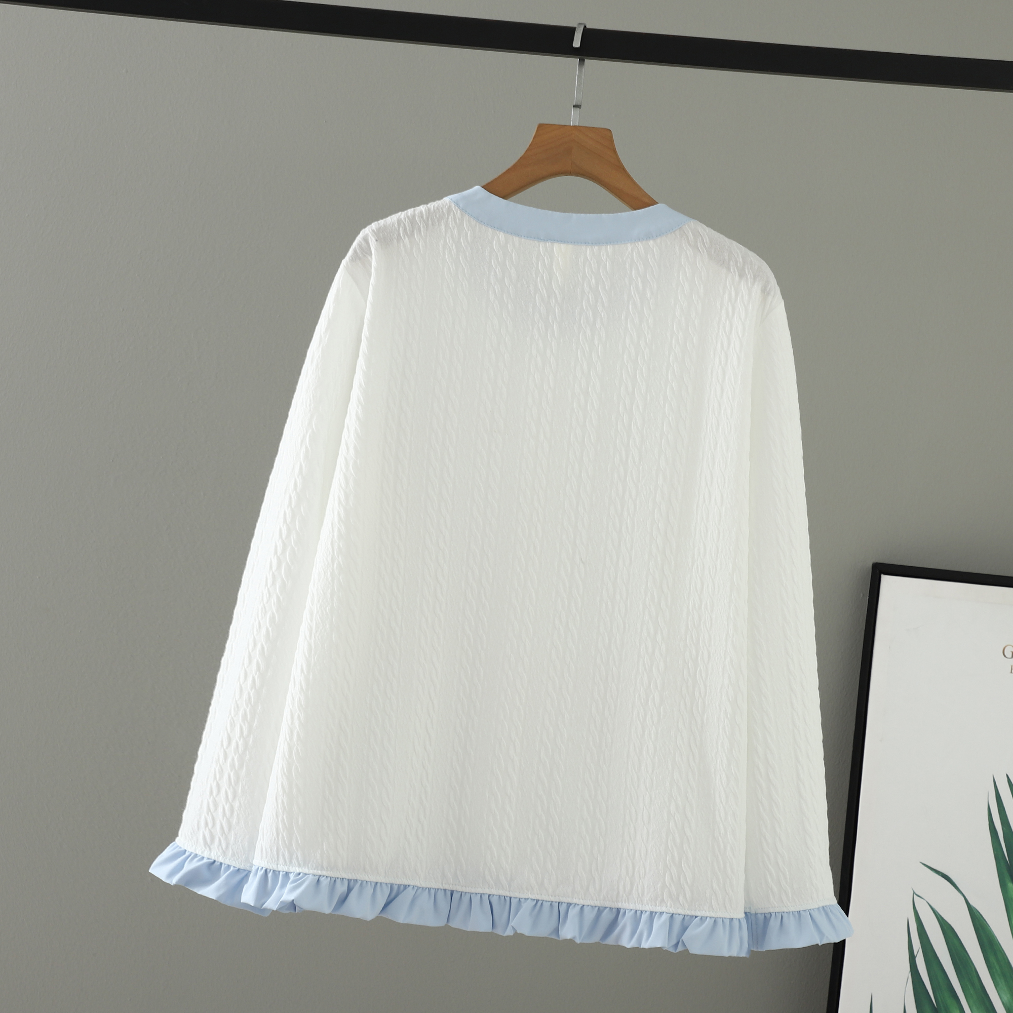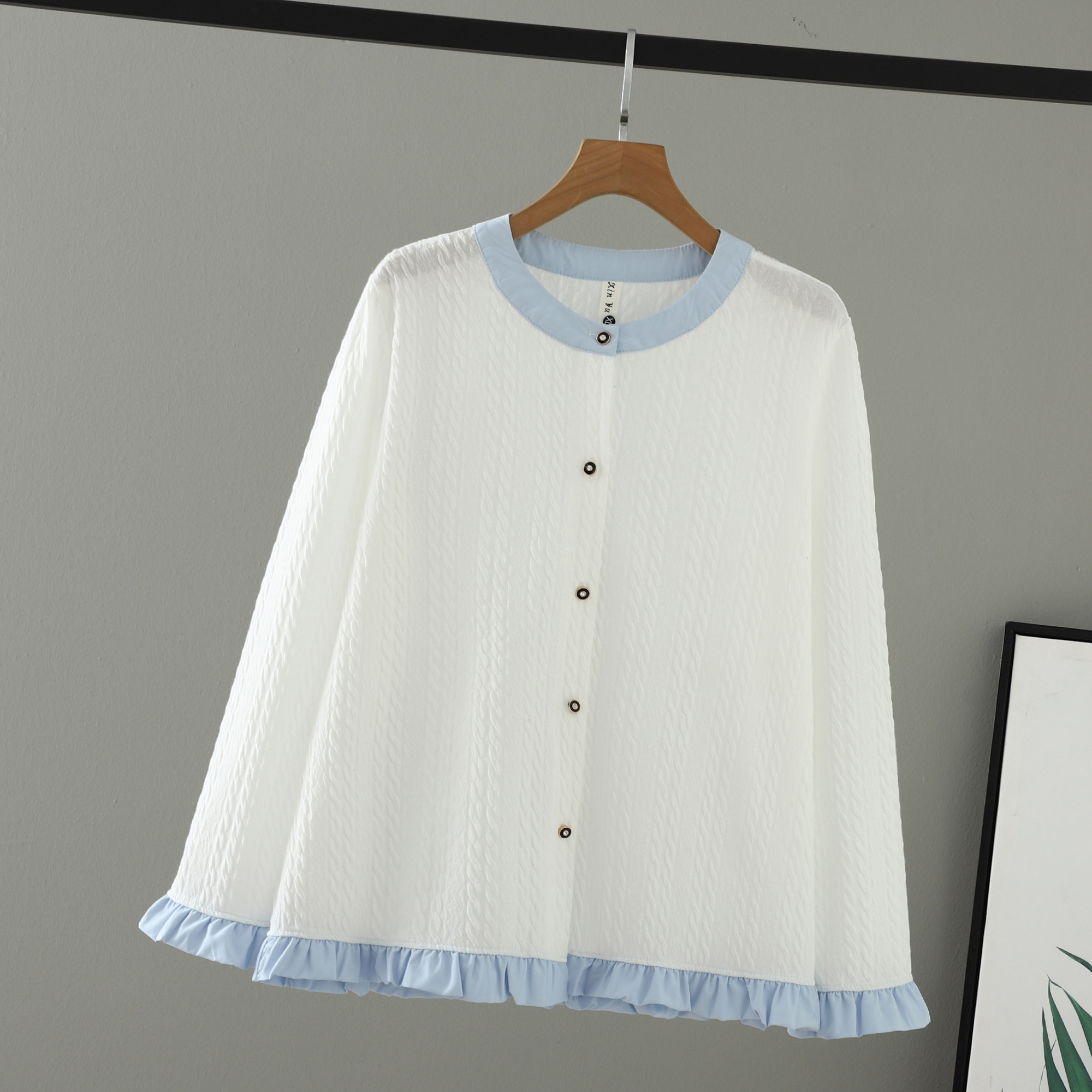 假两件圆领上衣撞色木耳边大码女