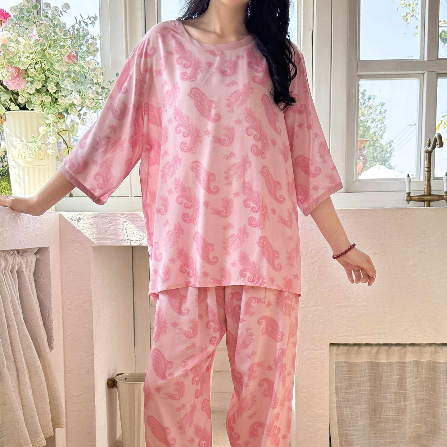 粉色棉绸睡衣女春夏季中袖长裤家居服甜美少女棉绸套装可外穿大码