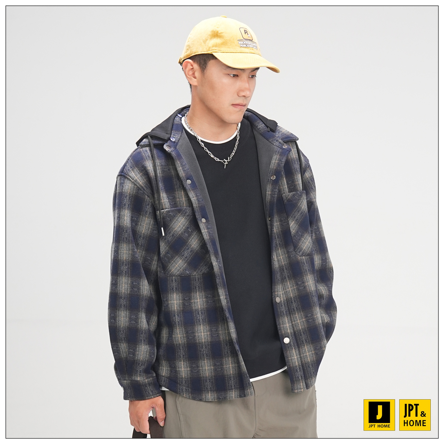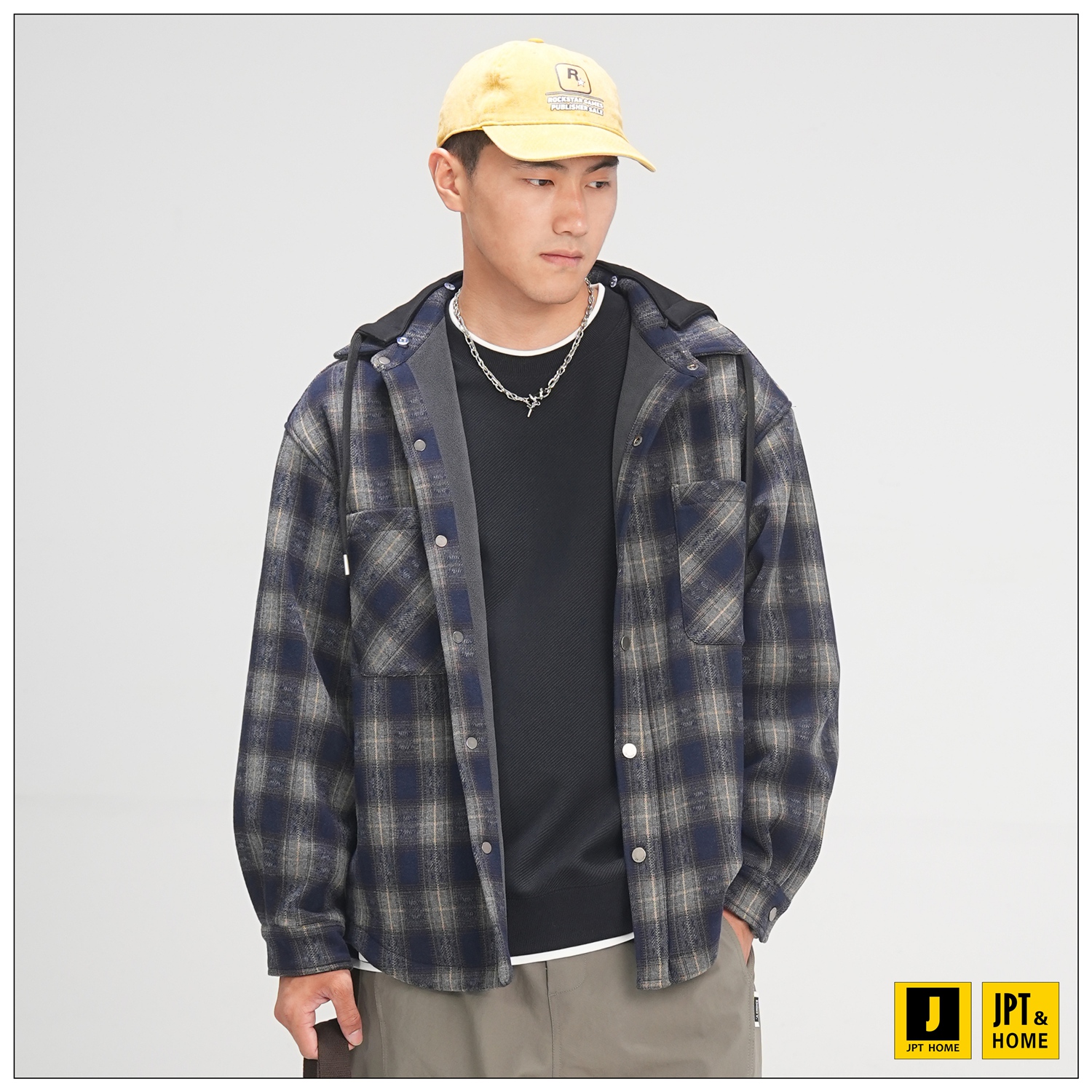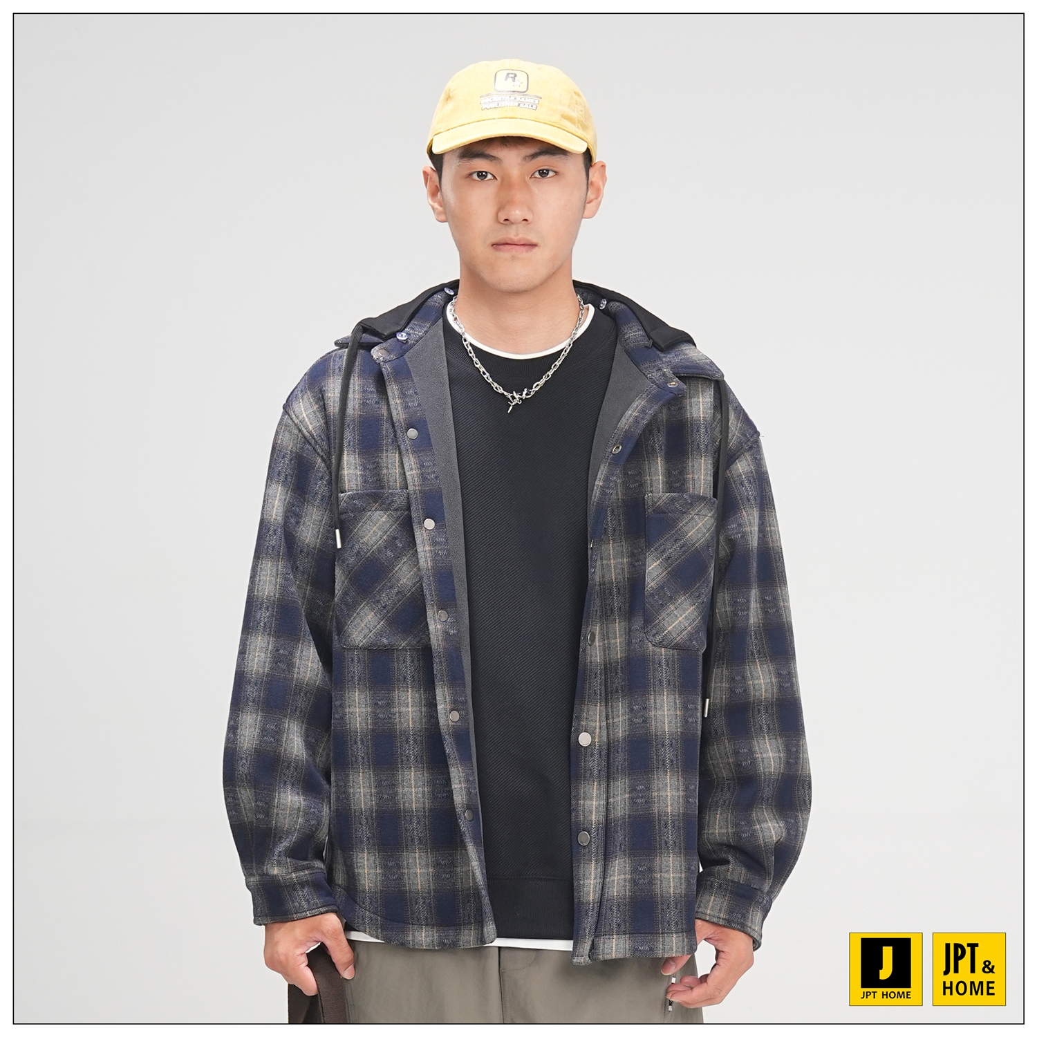 JPTHOME25冬复古街潮宽松版经典格纹装饰可拆连帽可加绒衬衫外套