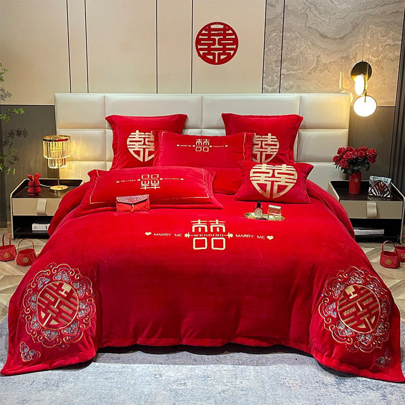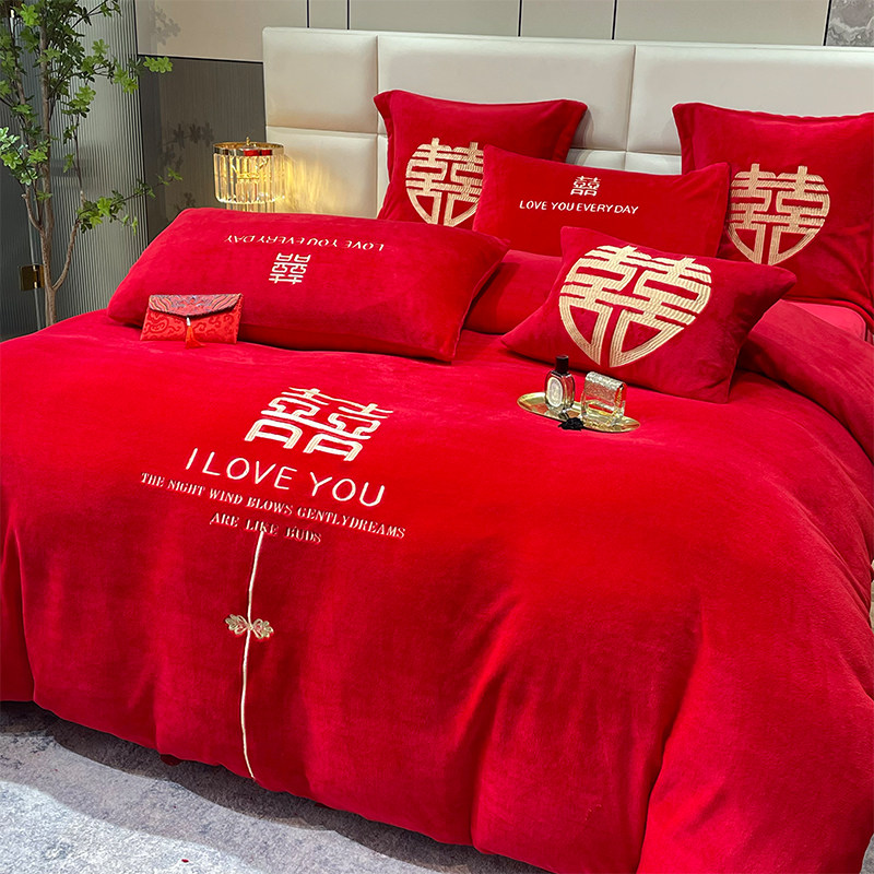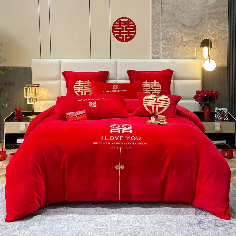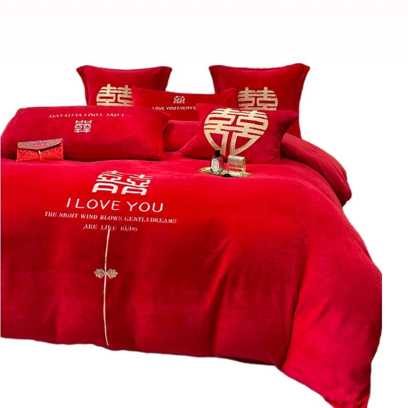 牛奶绒结婚四件套大红冬季珊瑚宝宝绒床单笠喜被新婚庆房嫁礼床品