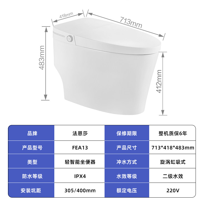 【政府补贴】法恩莎脚感冲水智能马桶烘干抗菌除臭坐便器FEA13