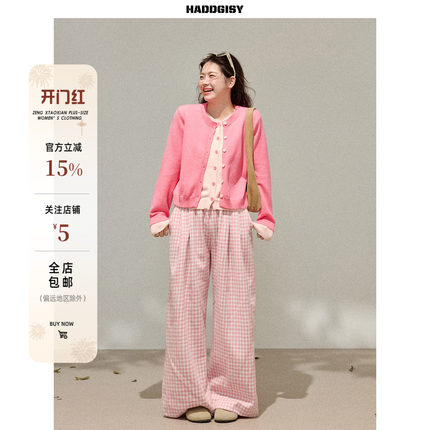 曾小咸大码女装 胖mm粉色假两件针织开衫上衣春季新款休闲裤套装