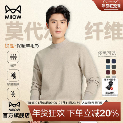 猫人羊毛衫莫代尔针织衫毛衣男士半高领秋冬保暖纯色打底衫内搭厚