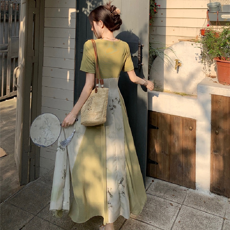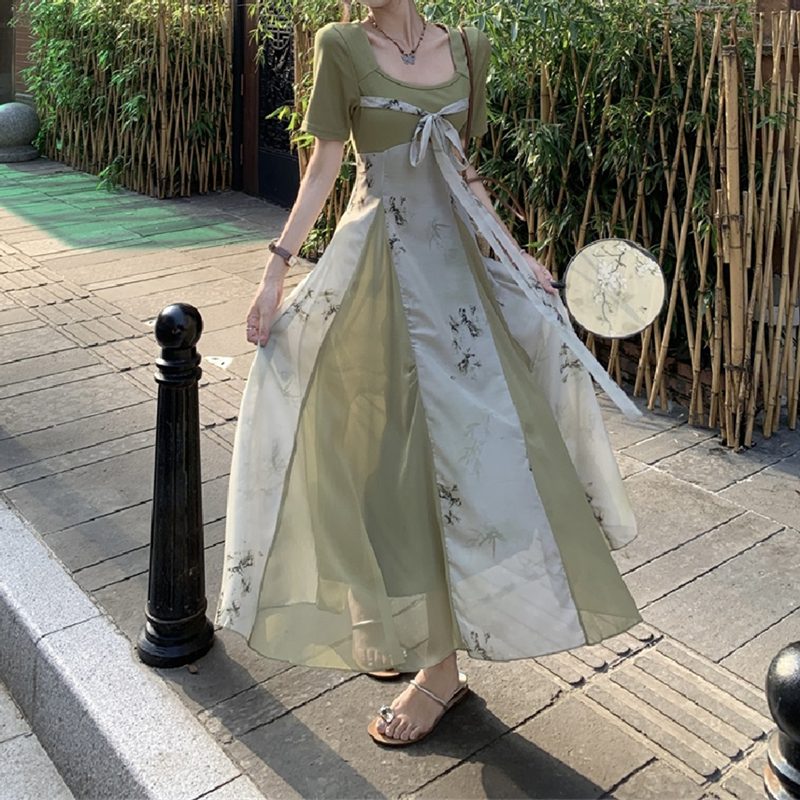 大码胖mm青云涧禅意新中式国风系带方领连衣裙女夏改良汉服旗袍裙