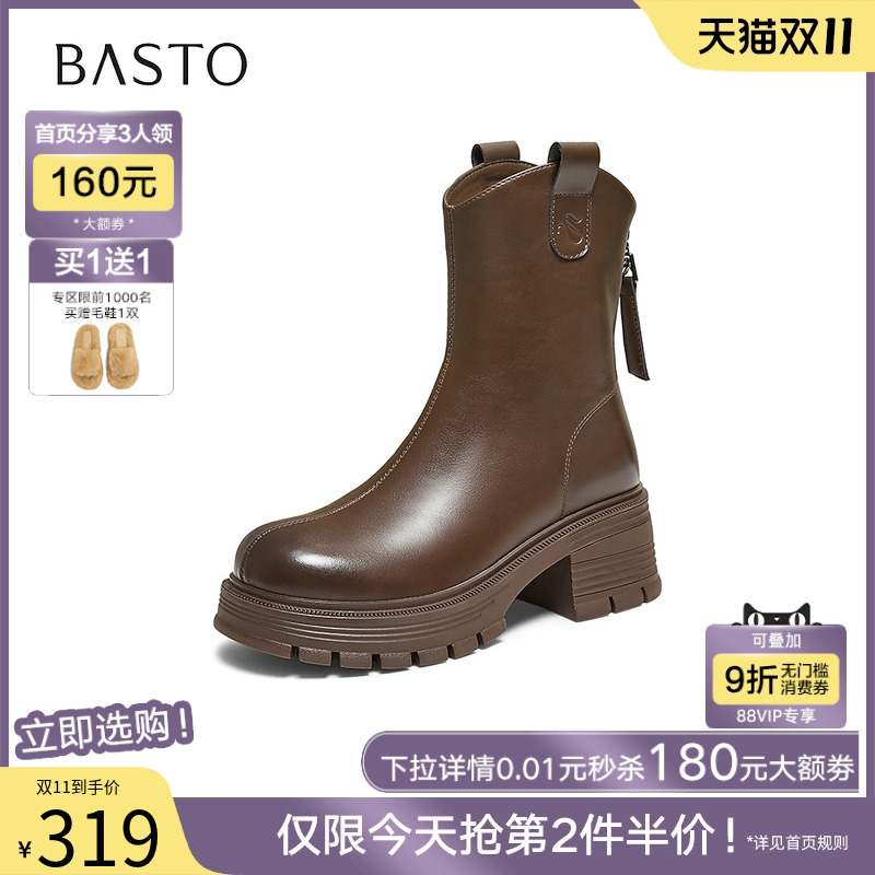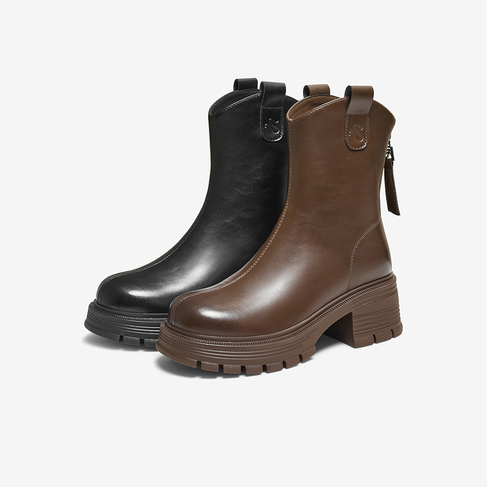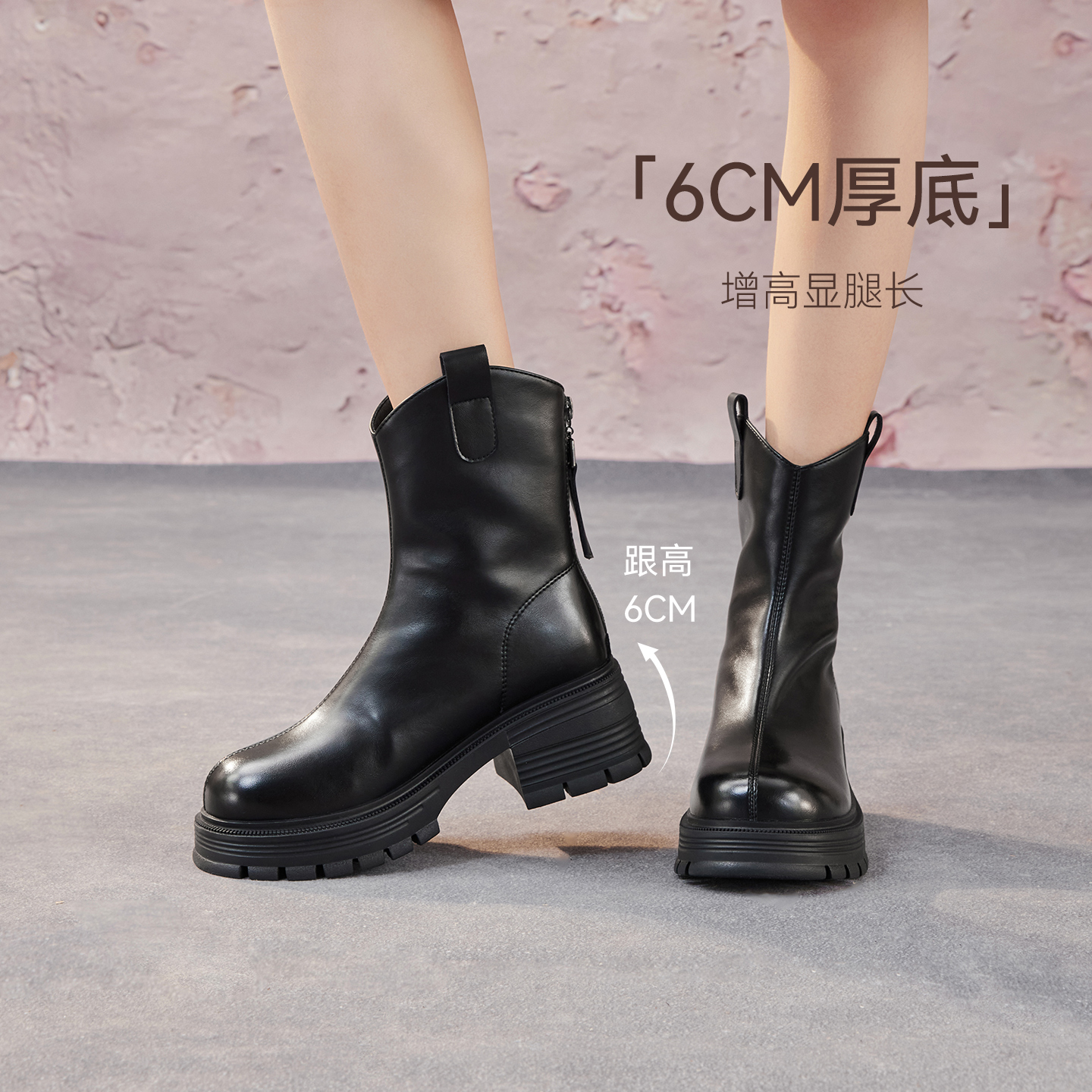 百思图2025冬季商场新款圆头粗跟美拉德V口女骑士短靴BV239DZ5