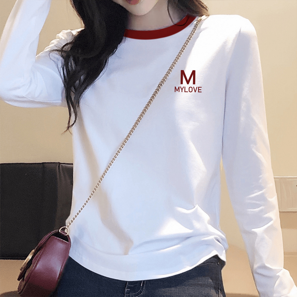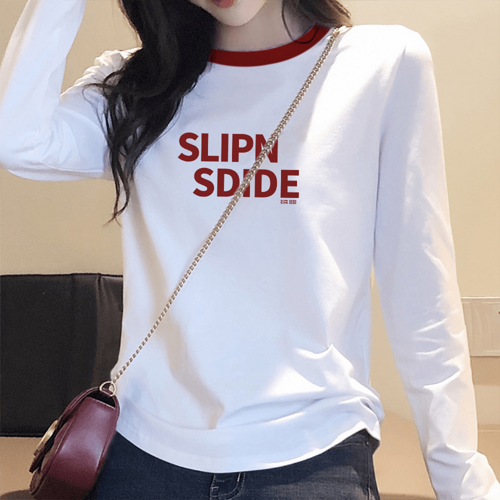 撞色圆领长袖t恤女小个子显瘦春秋2025新款拼接设计感纯棉打底衫