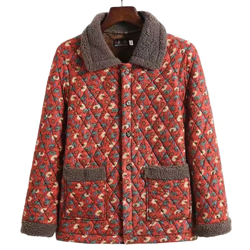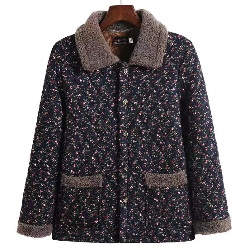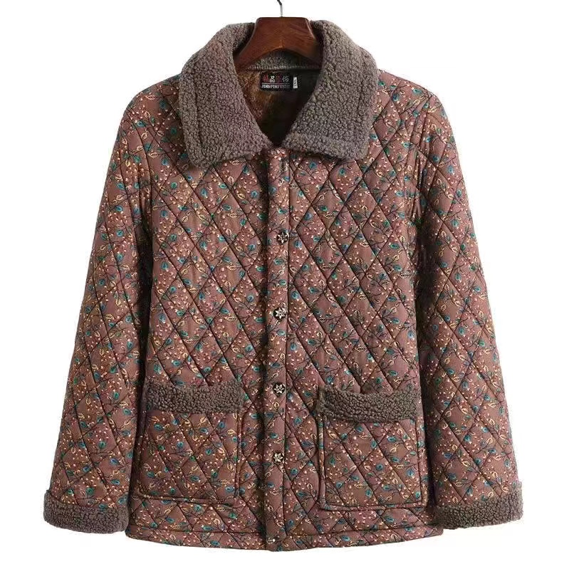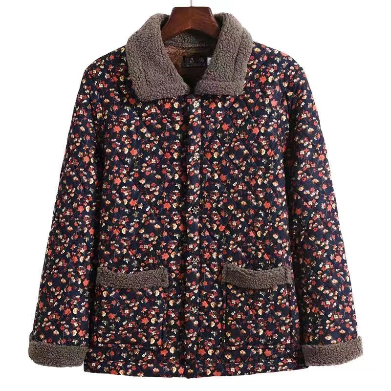 冬季老太太特厚棉衣老人加绒保暖棉袄女印花奶奶驼绒上衣翻领外套
