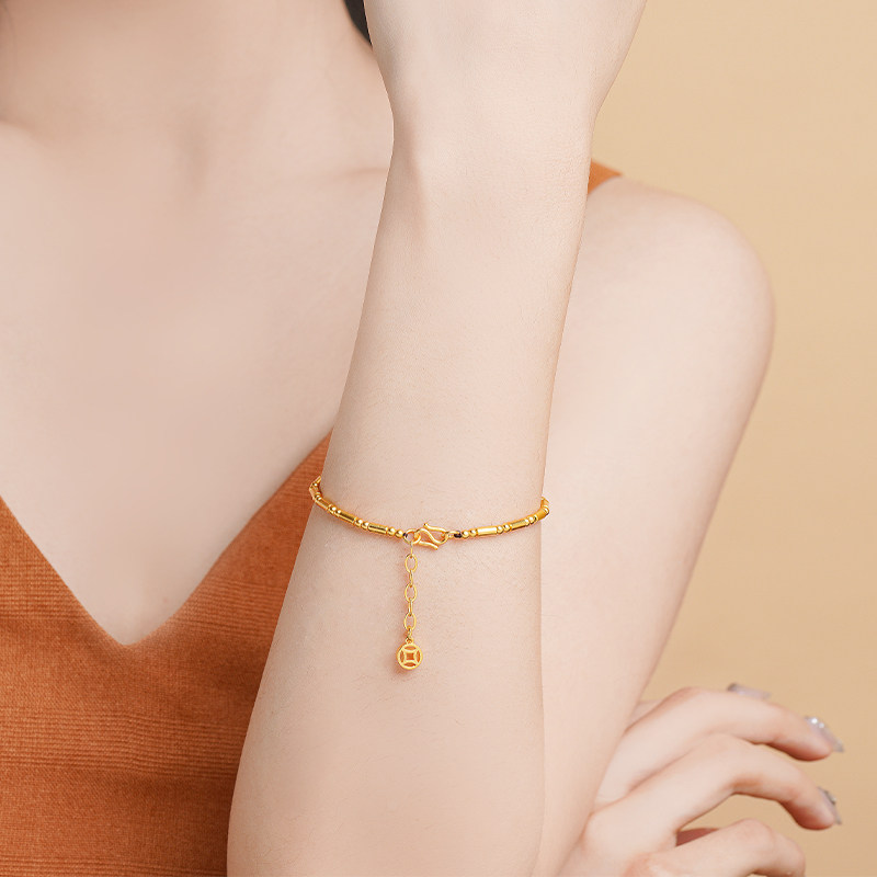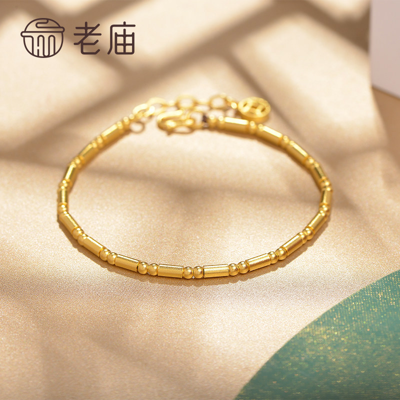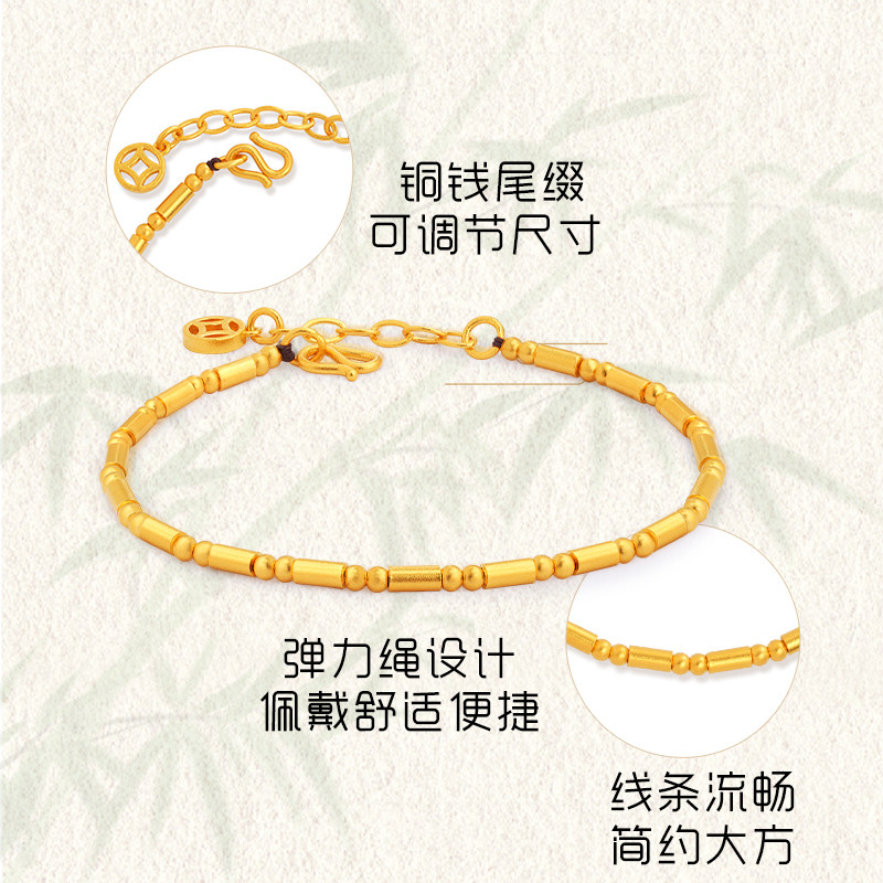 老庙黄金古韵优品古法金节高升竹节铜钱足金手链可调官方正品礼物