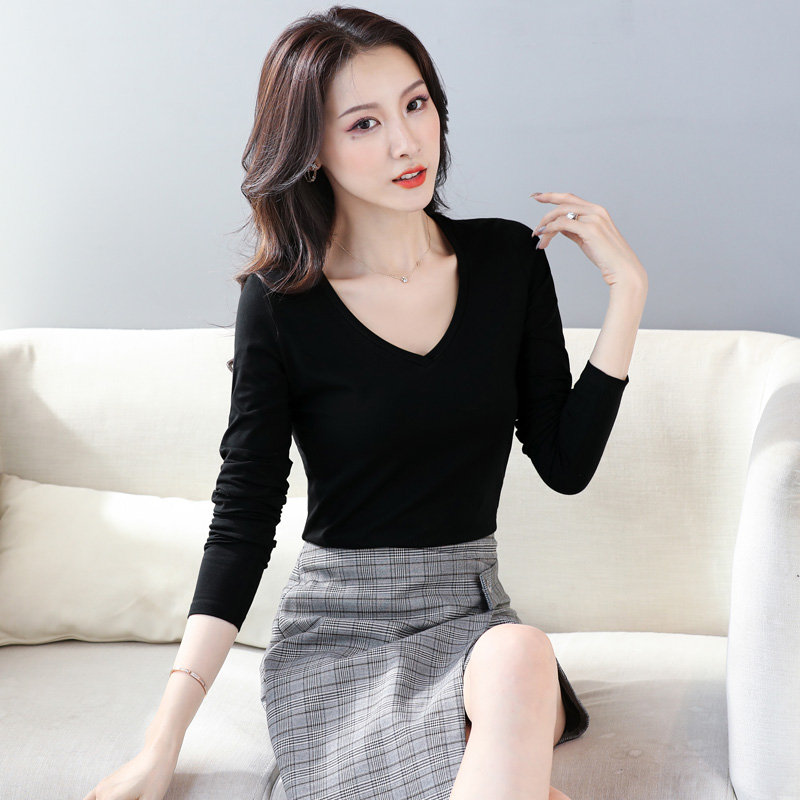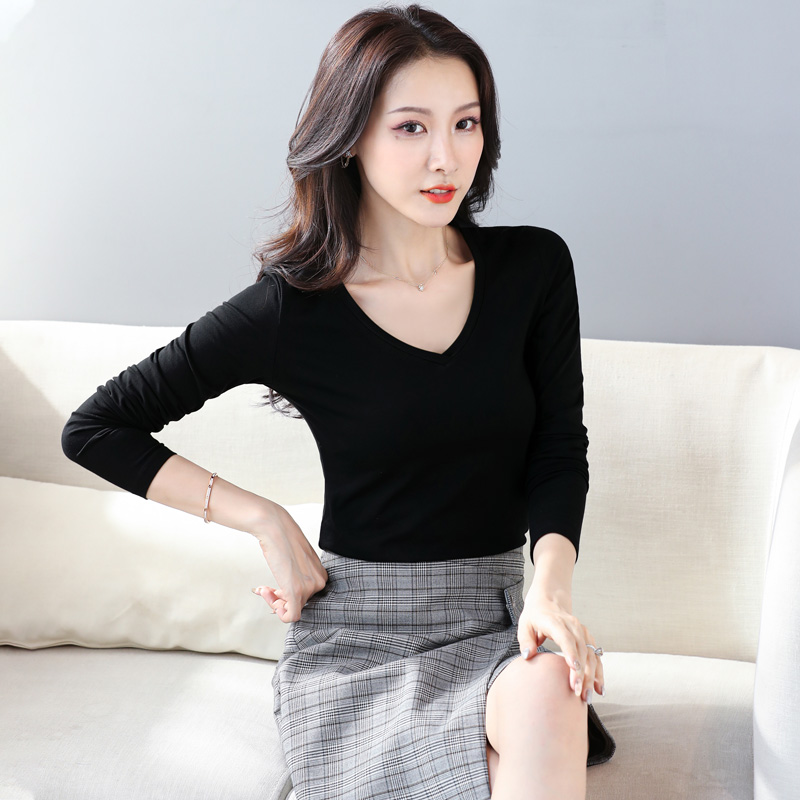 白色修身打底衫女长袖春秋冬洋气内搭紧身纯棉上衣v领T恤百搭体恤