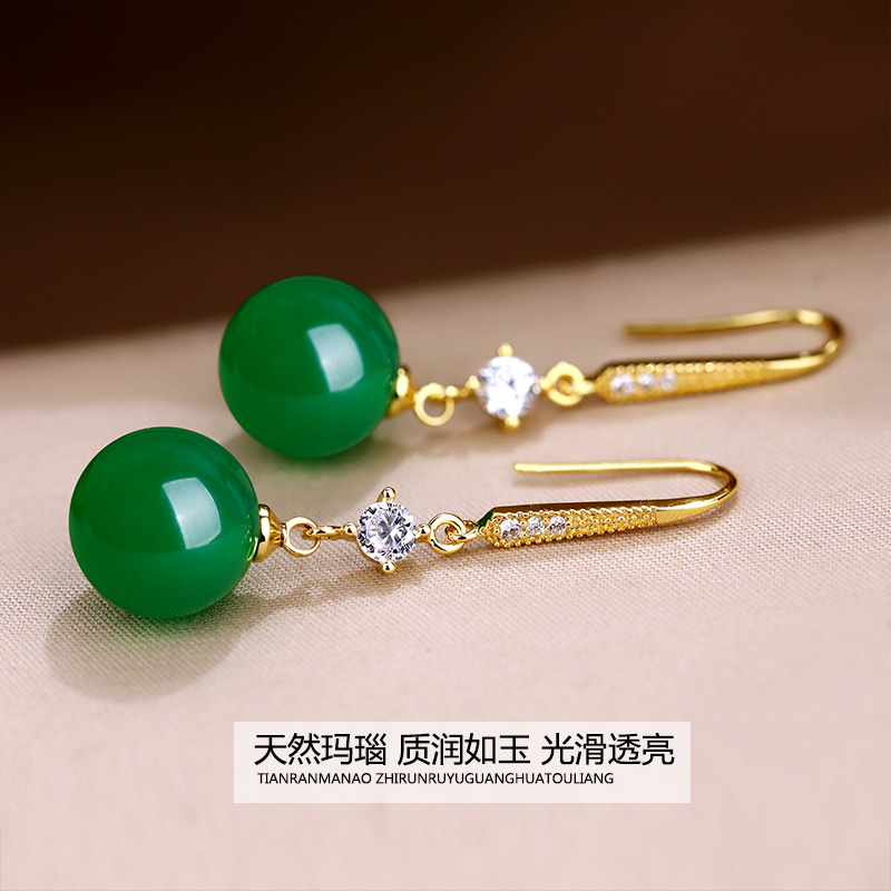 中国风天然玛瑙纯银耳环女14K金色耳坠高贵妈妈婆婆长款瘦脸耳饰