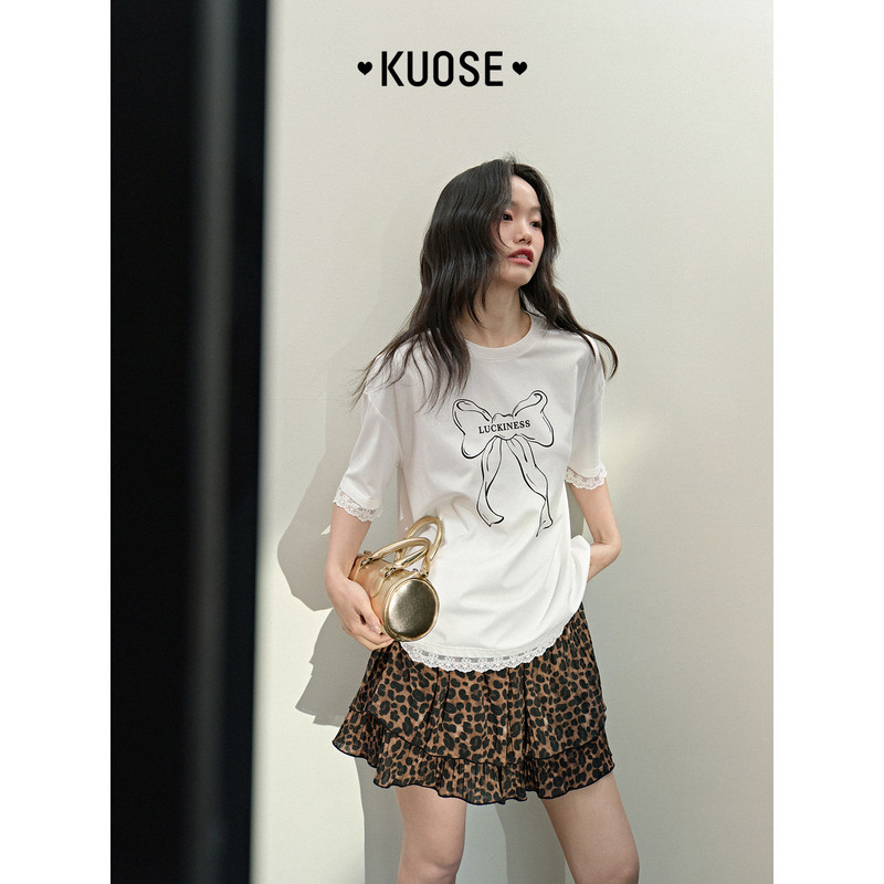 阔色白色蝴蝶结字母印花T恤女2025夏季新款蕾丝花边拼接短袖上衣